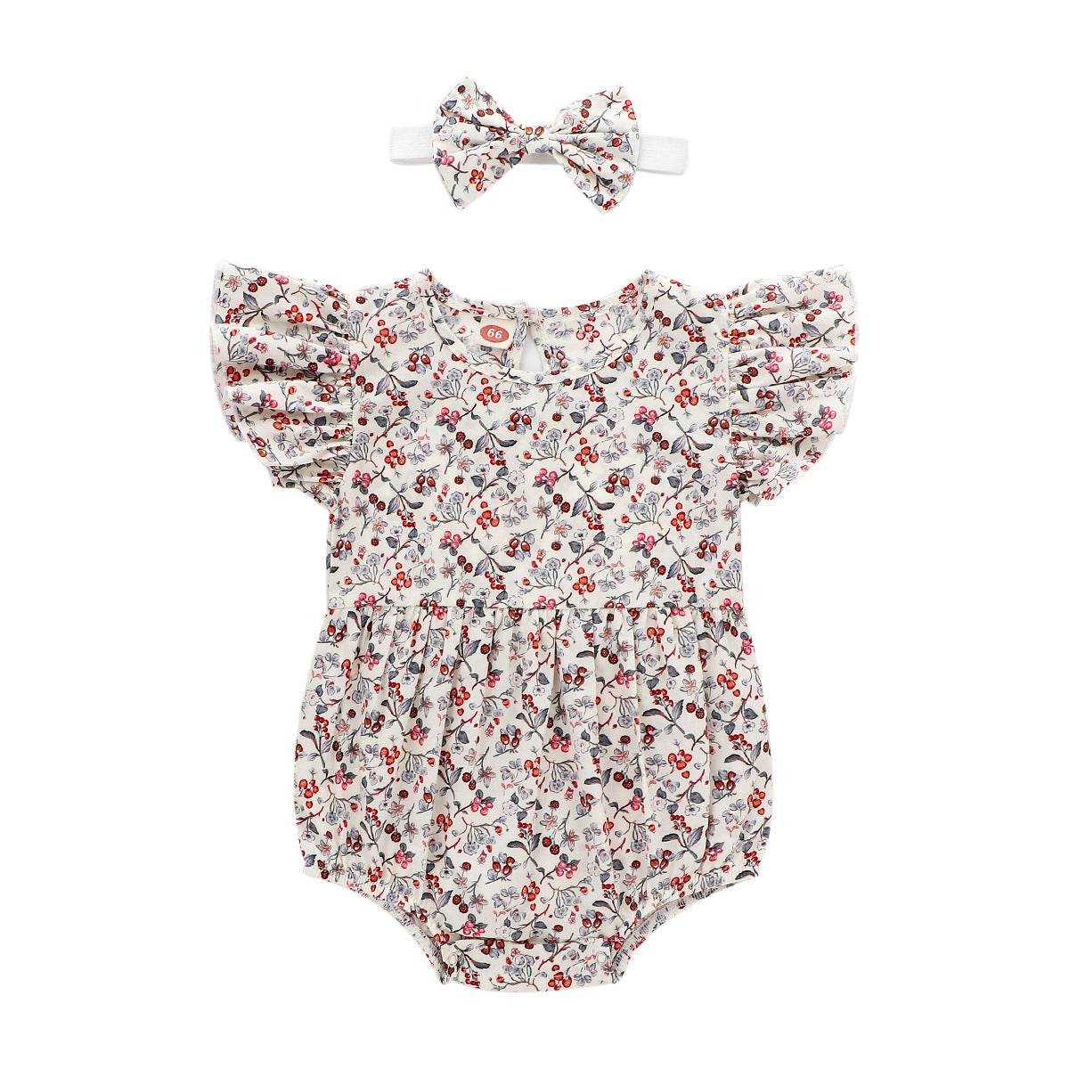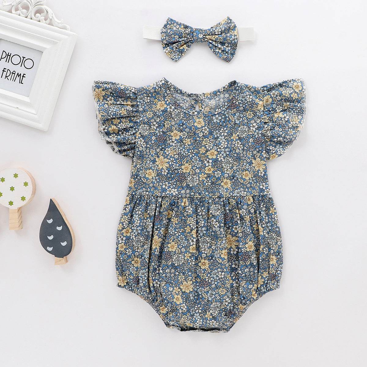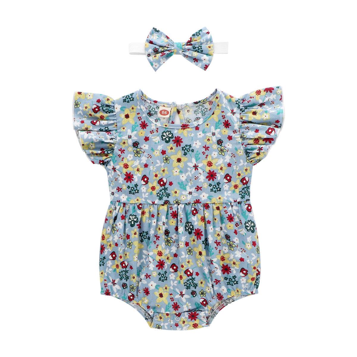 The floral pattern adds a touch of charm, while the flying sleeves and sleeveless design provide freedom of movement. Perfect for everyday wear, this outfit is designed with a triangle crawl for easy movement and comfort.