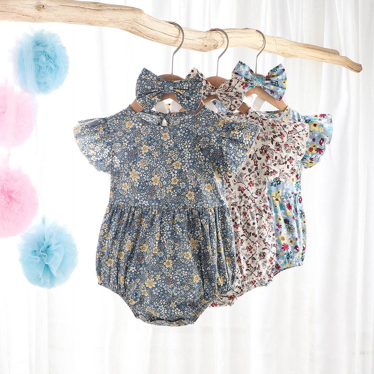 Newborn 0-3 Years Old Floral Flying Sleeve Sleeveless Triangle Crawl Baby Fart Clothes Triangle Crawl - Mubimart