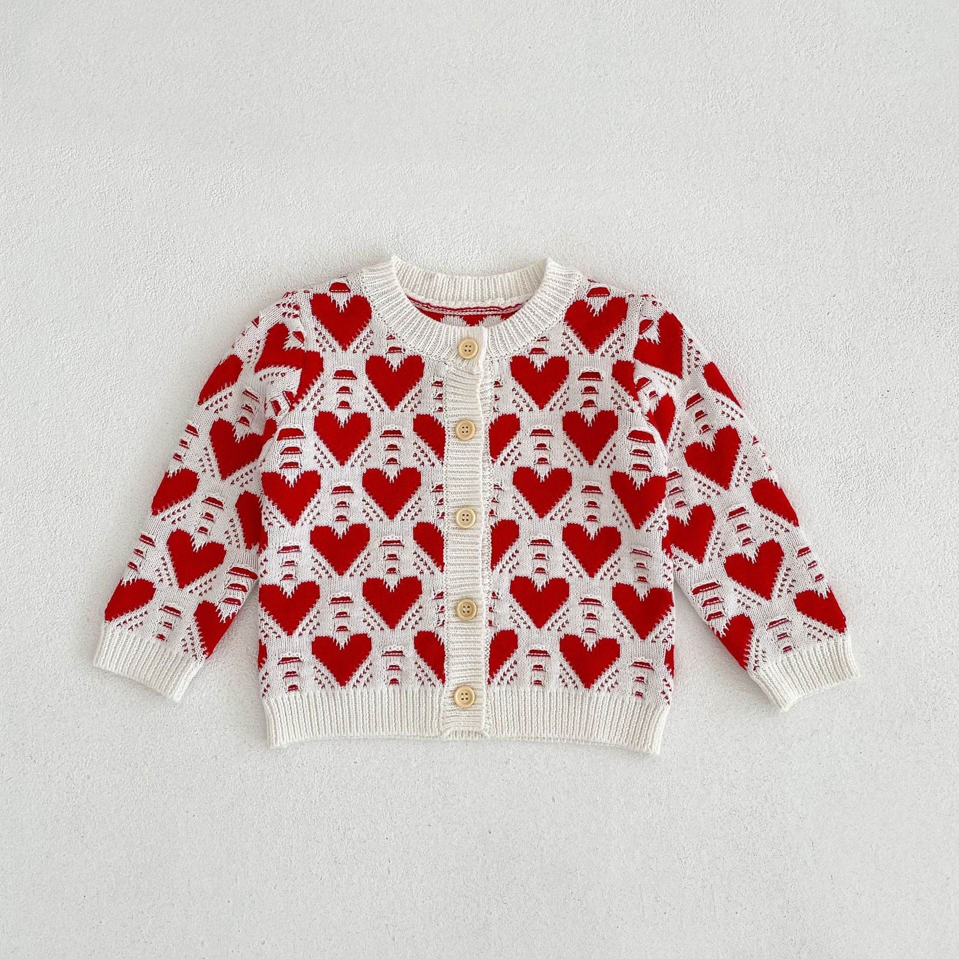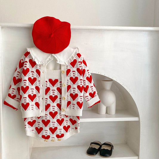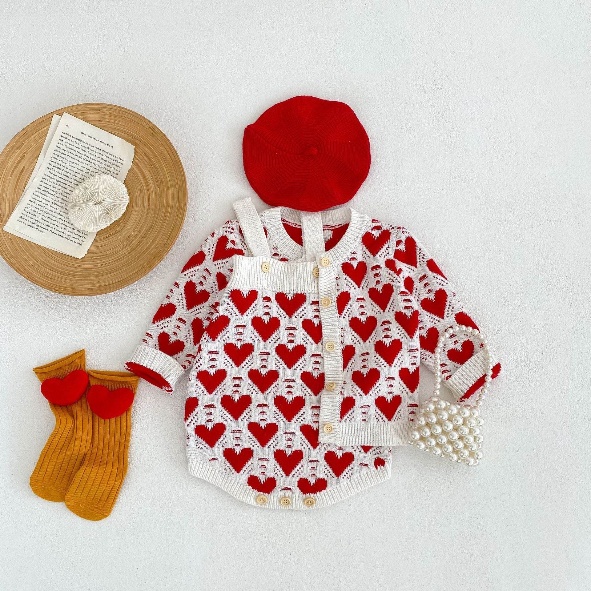 Baby Girl And Baby Knitted Love Jacquard Sweater Coat Shoulder Strap Romper 2 Piece Suit