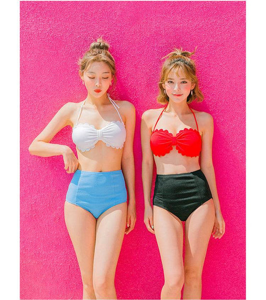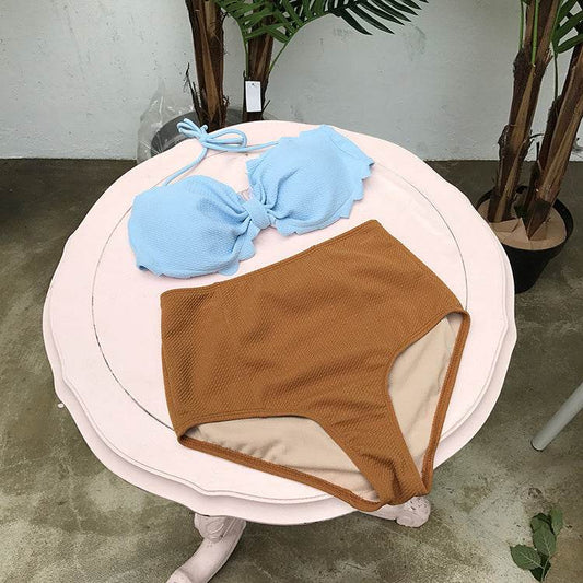 Shiying Halter Lace-up Swimsuit Striped Ruffled Blue Color Split Bikini