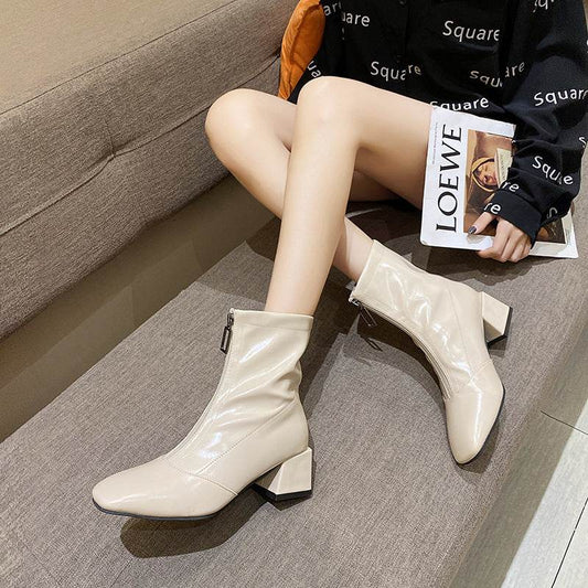Square Toe Block Heel Zipper High Heel Martin Boots - Mubimart