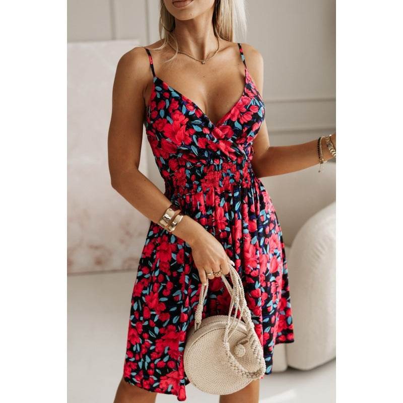 Fashion Flowers Print Suspender Dress Summer V-Neck Pleated Short Dresses For Beach Womens Clothing