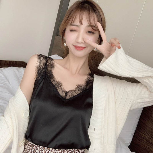 Deep V Satin Women's Short Thin Shoulder Strap Glossy Camisole Bottom Wrap Chest