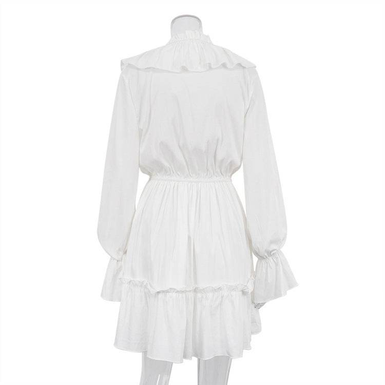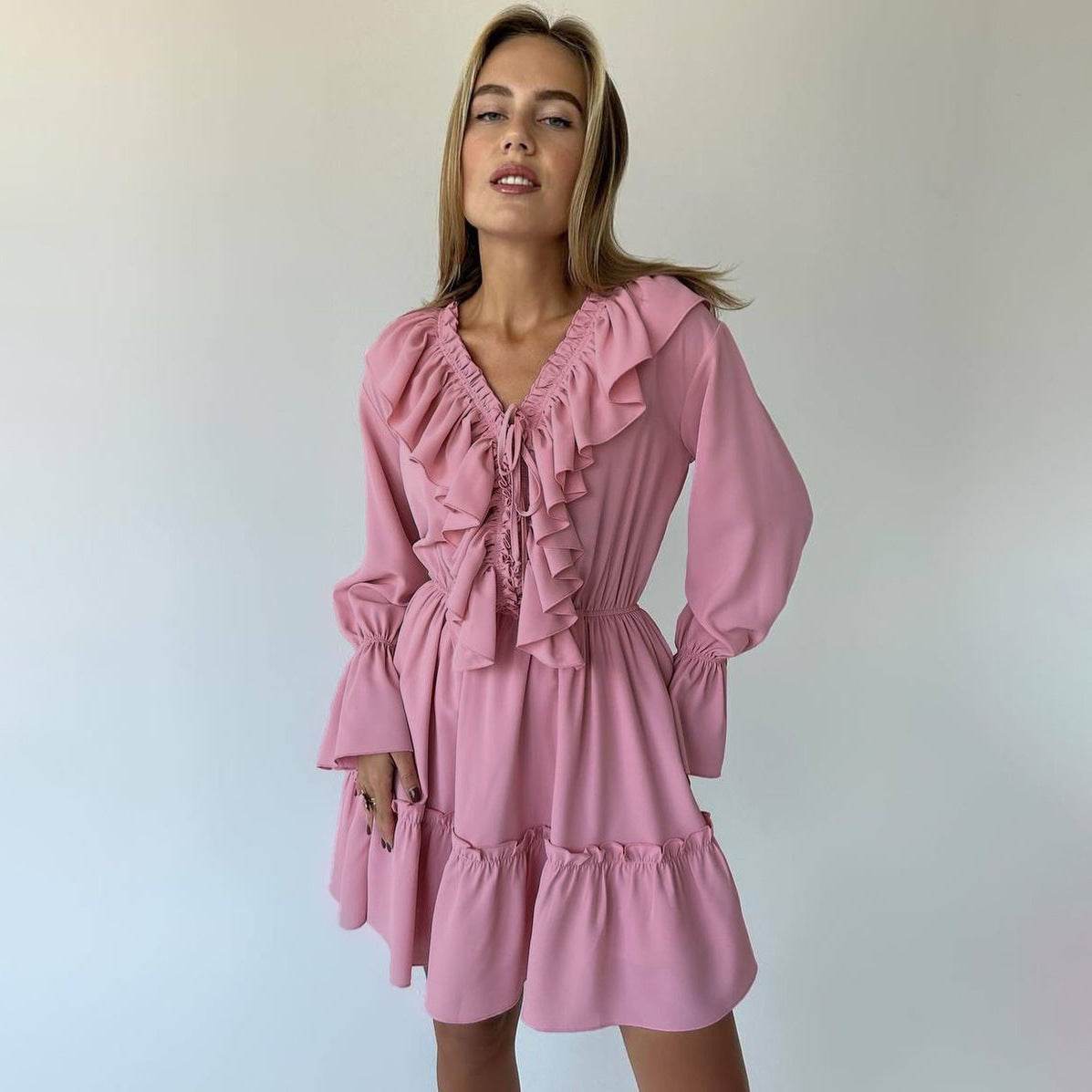 Fashion V Neck Pleated Ruffle Long Sleeve Dress Y2K V Neck Flared Sleeve Short Dress Women's Clothing - Mubimart