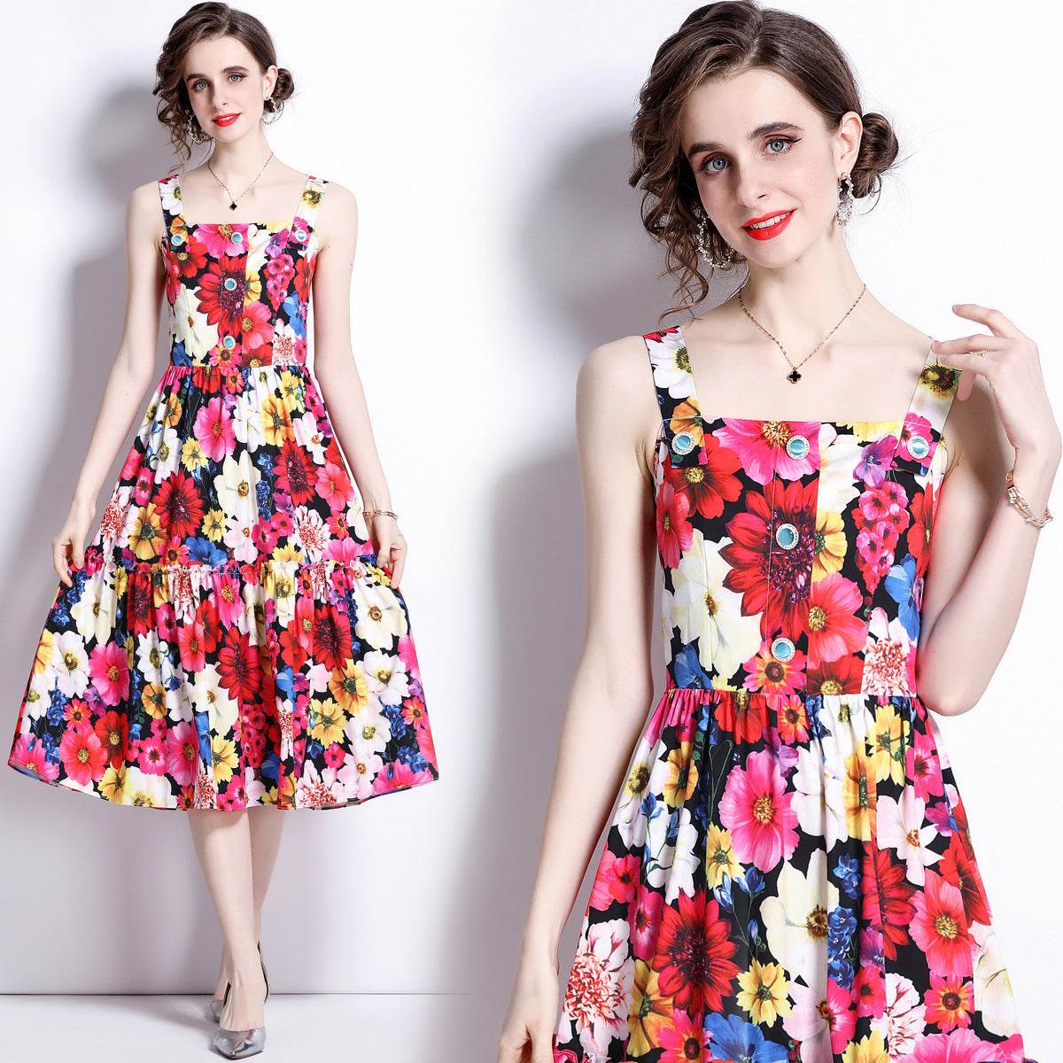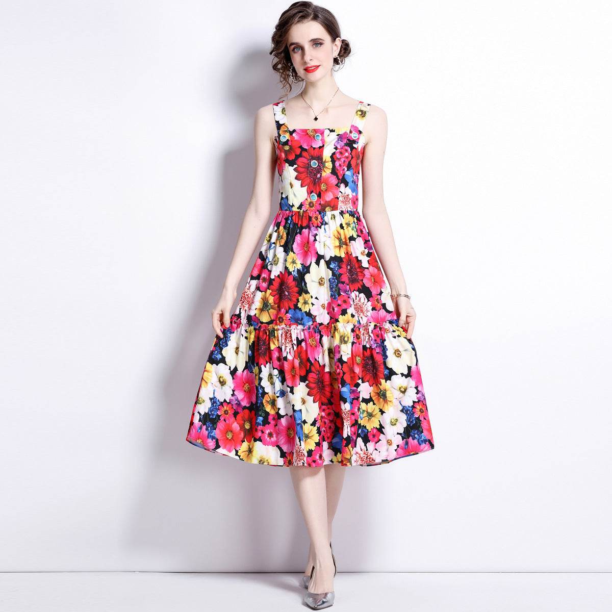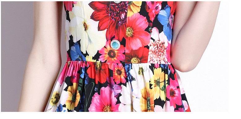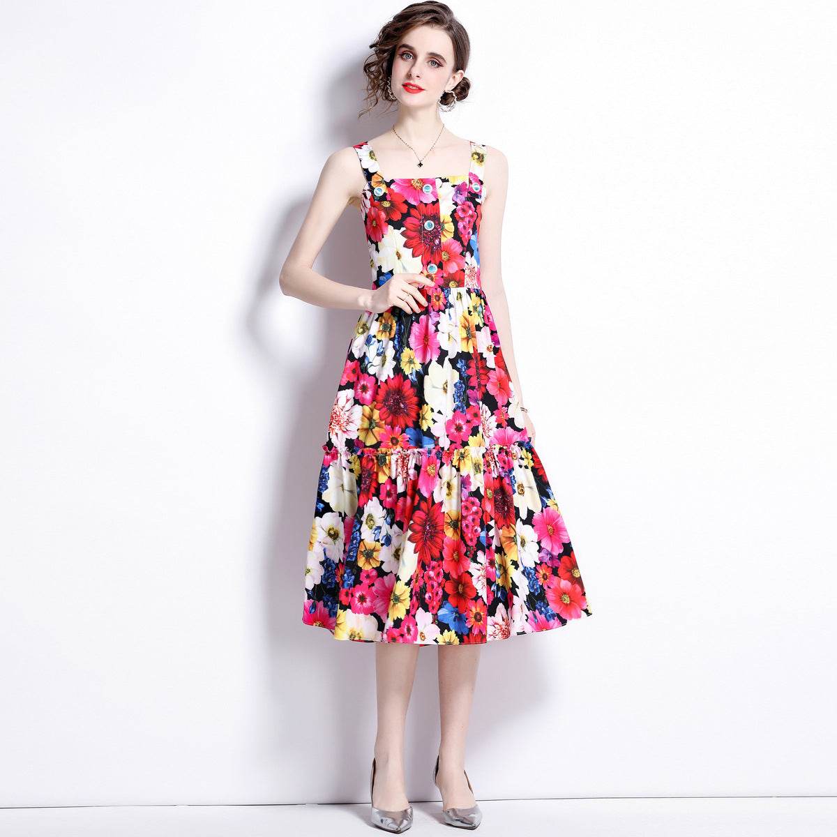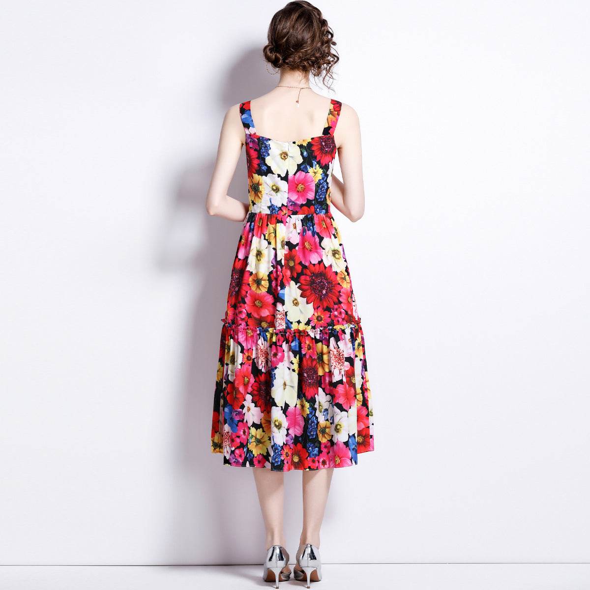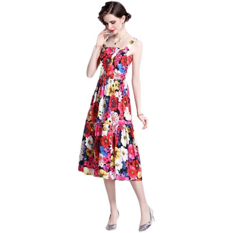 French Slip Dress Summer Print Flounces Vacation - Mubimart
