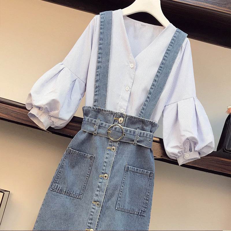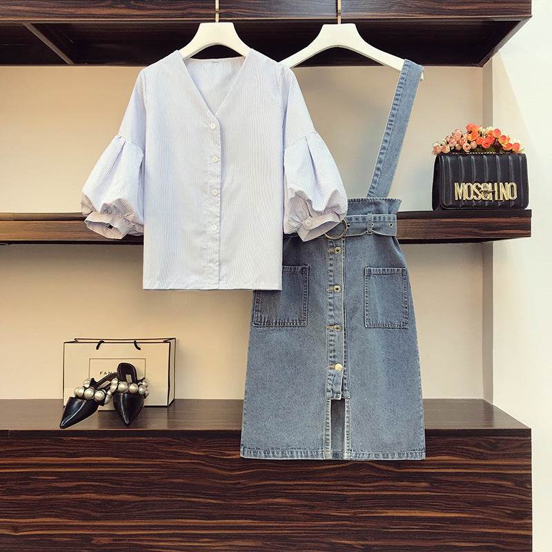 Fat Sister Plus Size women's Summer Dress New Women's age-reducing Fashion Jacket Denim Strap Skirt Two-piece Suit