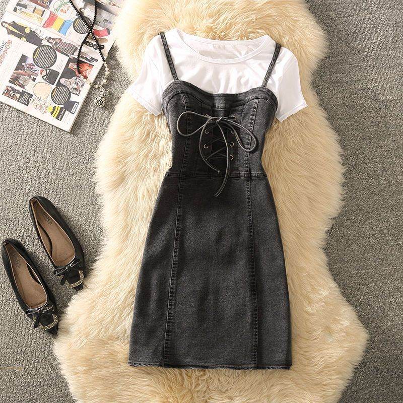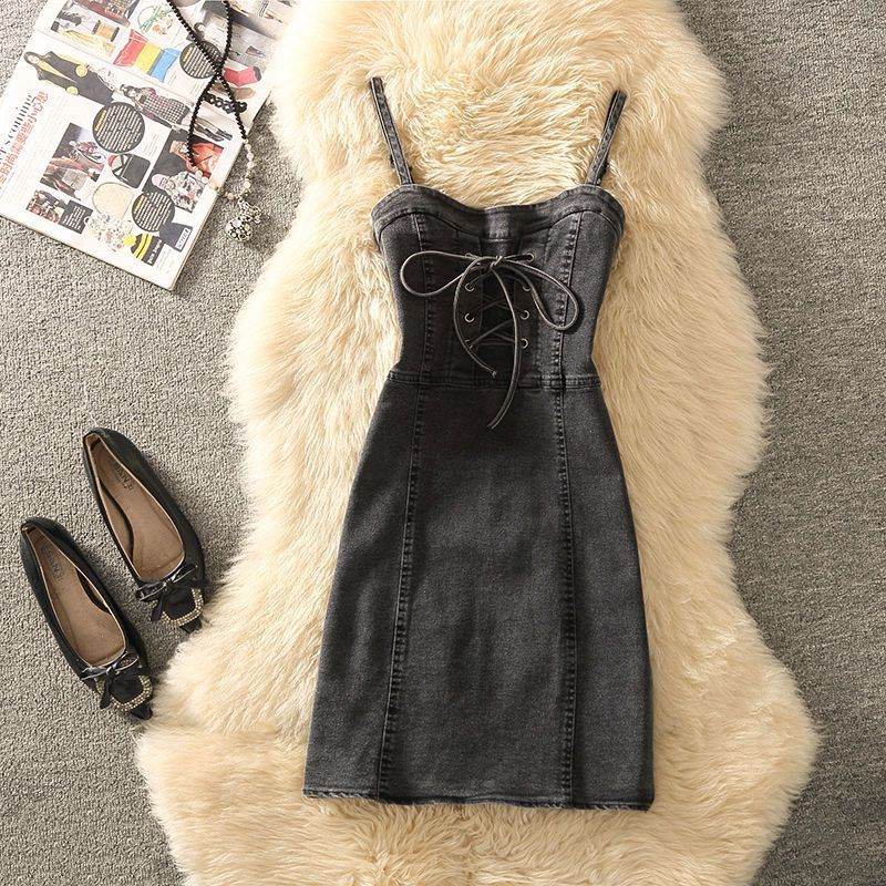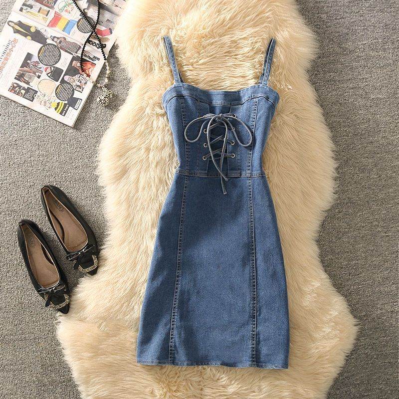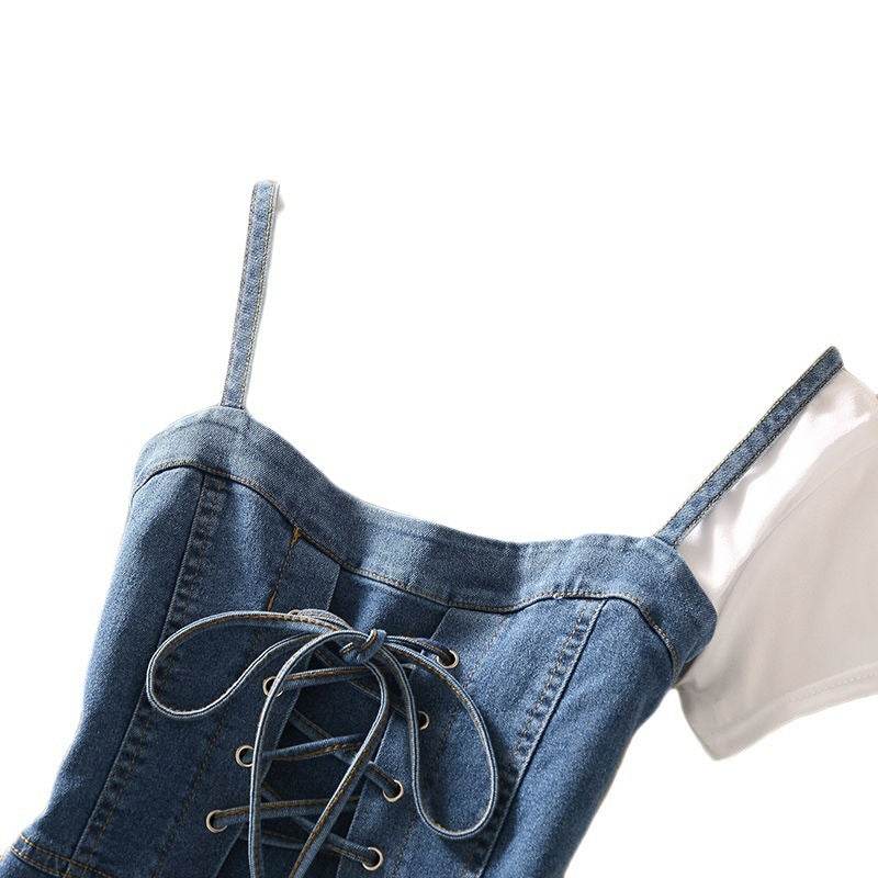 Summer Clothing Denim Braces Skirt Waist Trimming Lace Up Small Size Dress Suit