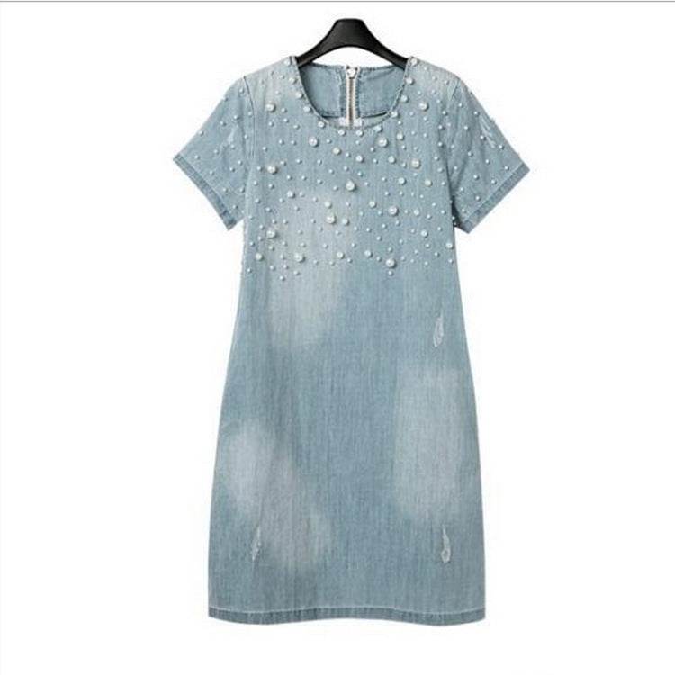 Summer new European and American large size women's washed beaded loose short-sleeved denim dress