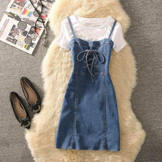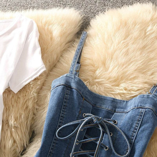 Summer Clothing Denim Braces Skirt Waist Trimming Lace Up Small Size Dress Suit