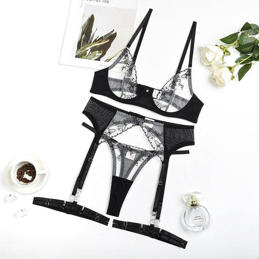Embroidery Splicing Underwear And Garter Belt Set O - Mubimart