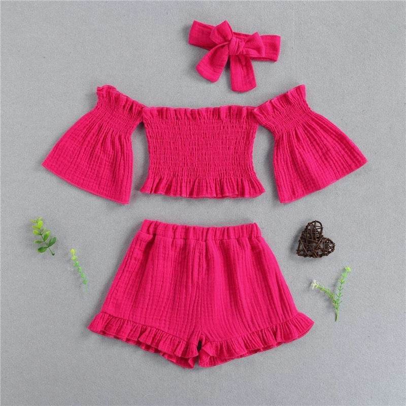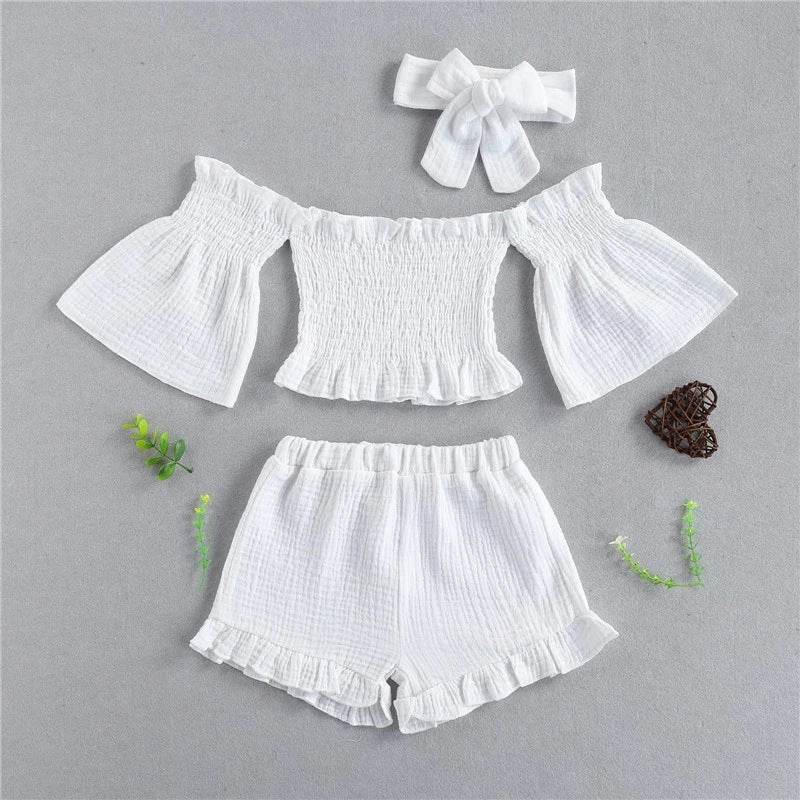 Summer Girls' Suit One-Shoulder Folds Flared Sleeve Shorts Three-Piece Shorts