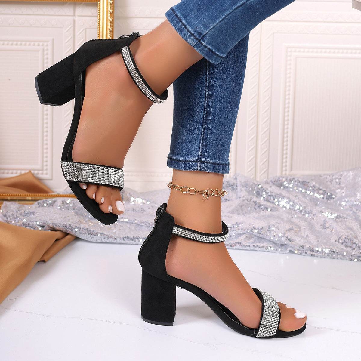 Rhinestone High Heel Sandals Summer Chunky Square Heel Sandals Open Toe Strappy Shoes