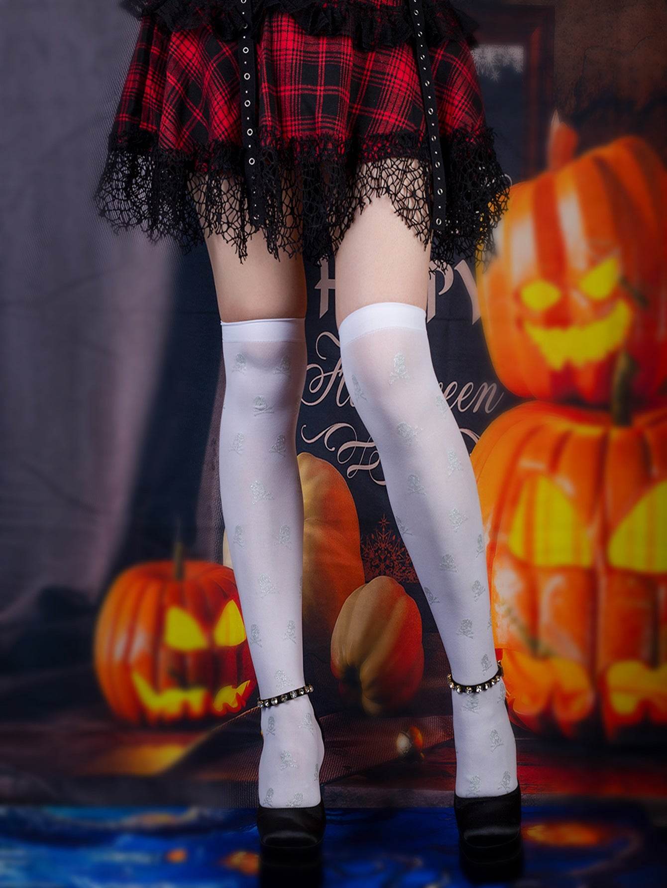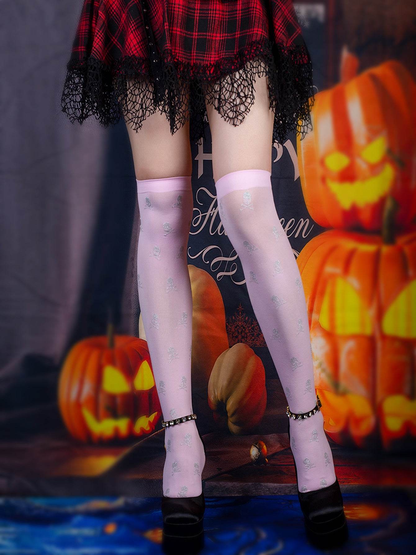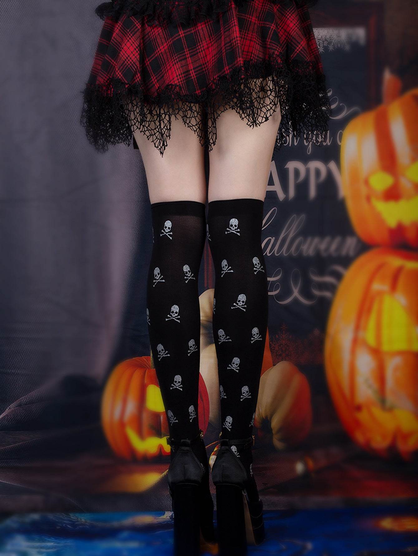 Halloween Black Over-the-knee Printed Skull Thigh High Socks