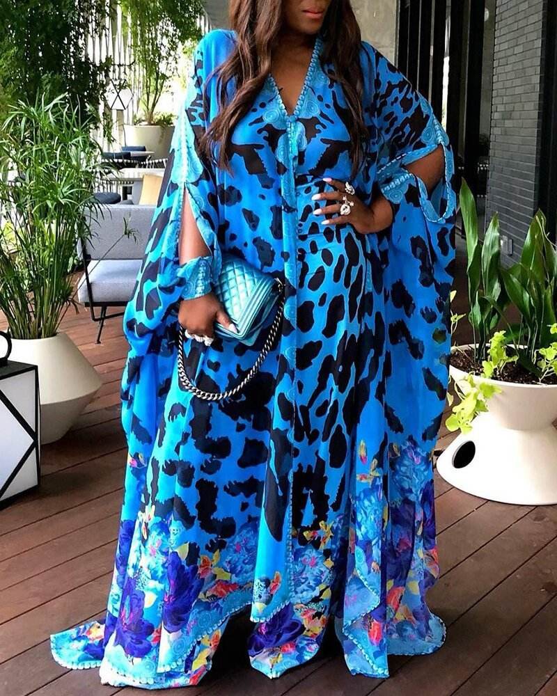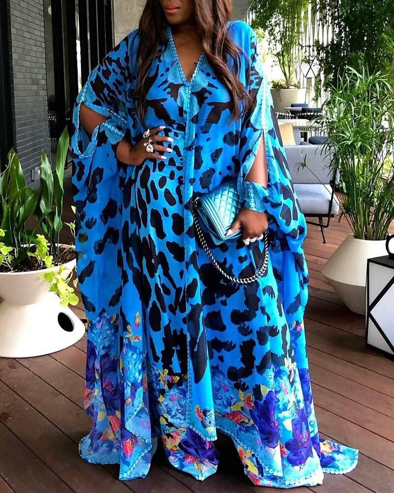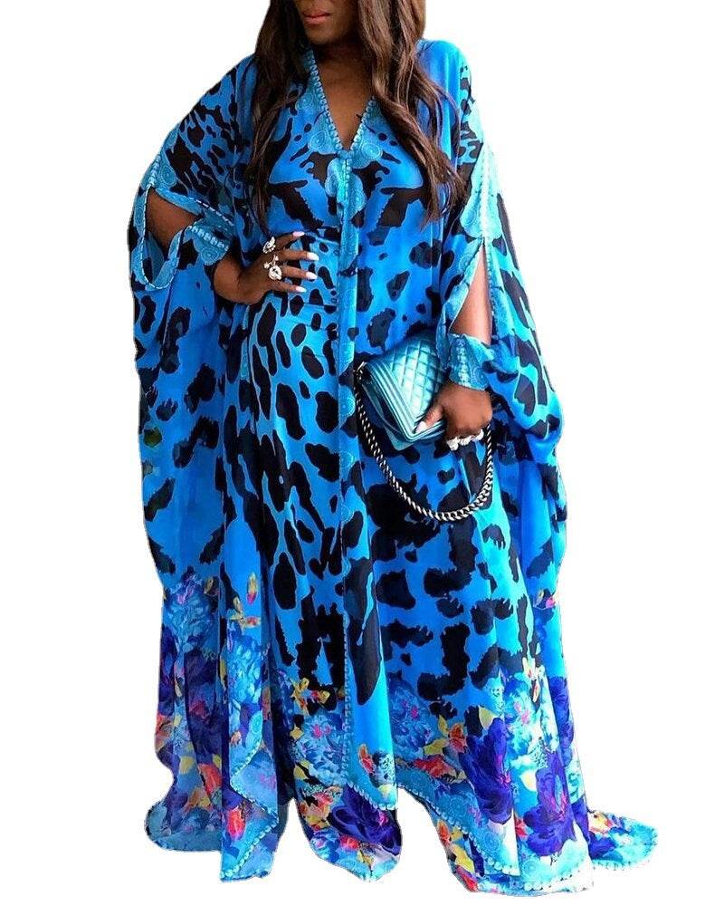 Large Size Women's Printed Loose High Waist Temperament Commuter Blue Maxi Dress - Mubimart
