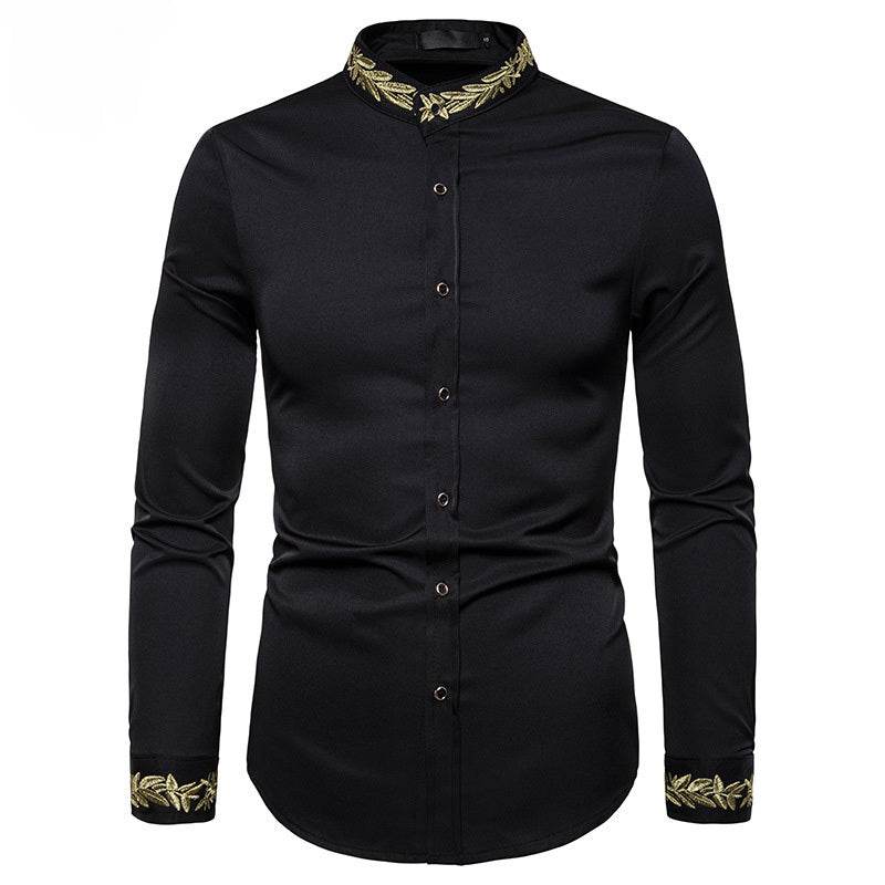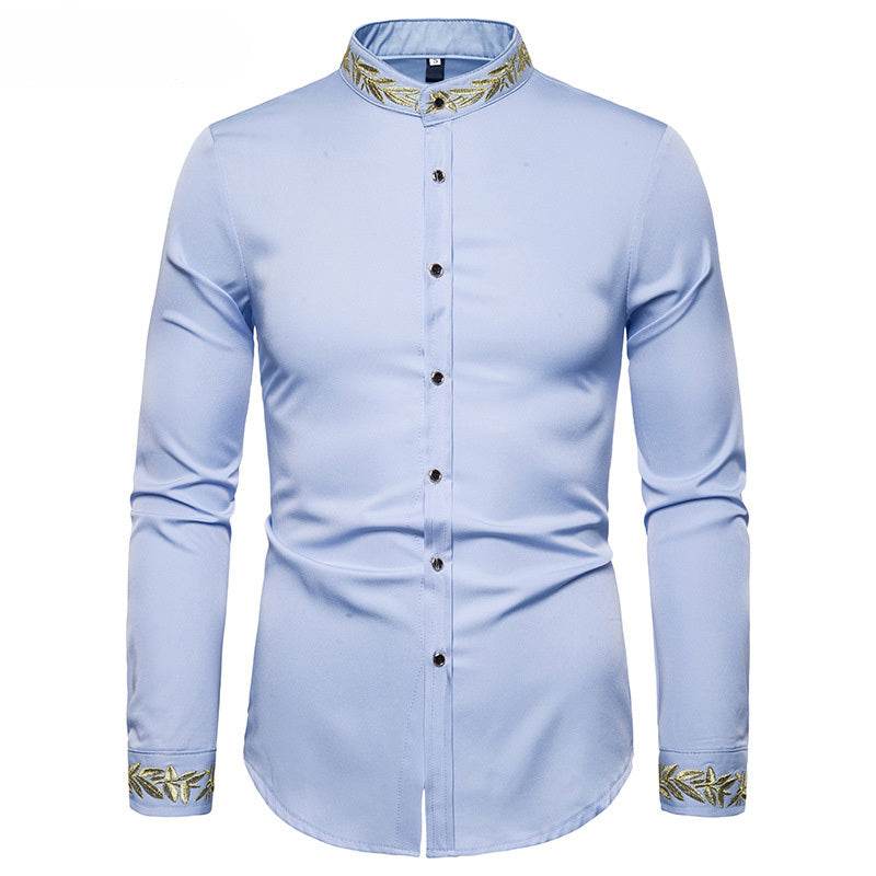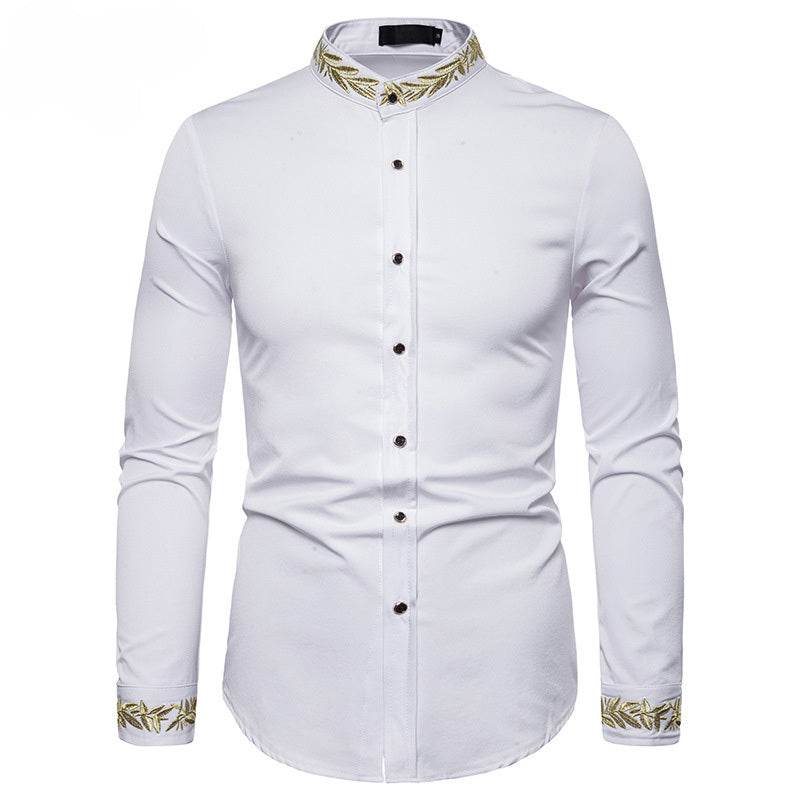 Gold Embroidery White Shirt Men Brand New Stand Collar Mens Dress Shirts Casual Slim Long Sleeve Chemise Homme Camisa Masculina