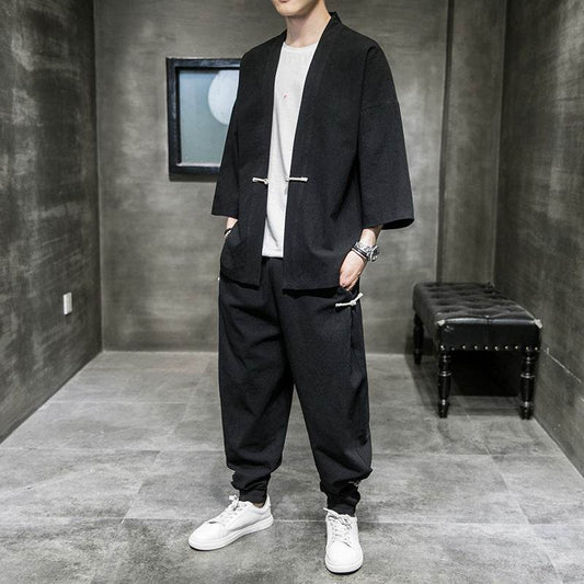 Chinese Style Linen Suit Men's Summer Three-Quarter Sleeves Robe Hanfu Loose Sun Protection Clothing Large Size Mens Sang Suit Cardigan - Mubimart