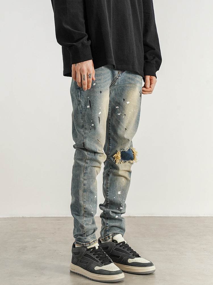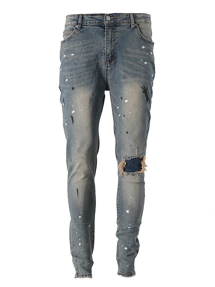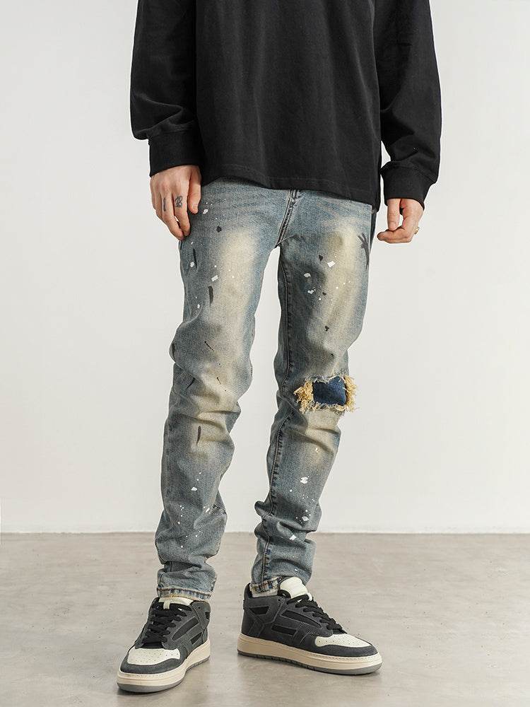 Slim-fit Slim-fit Jeans With Splashed Ink And Ripped Patches