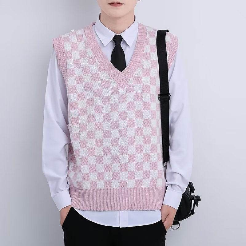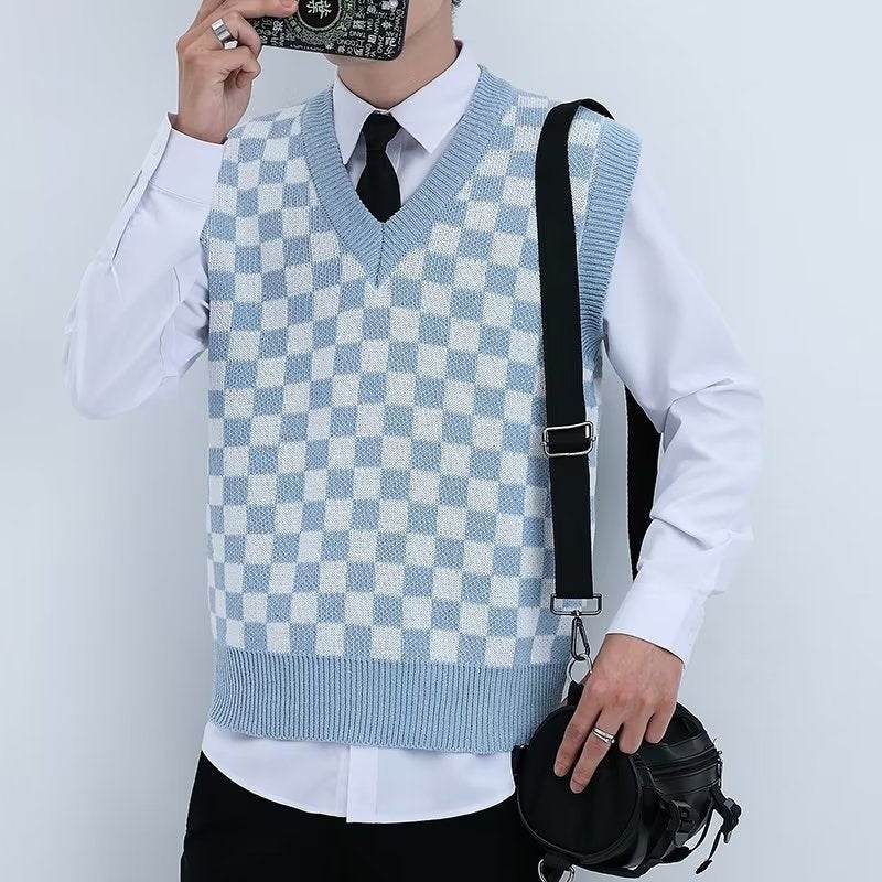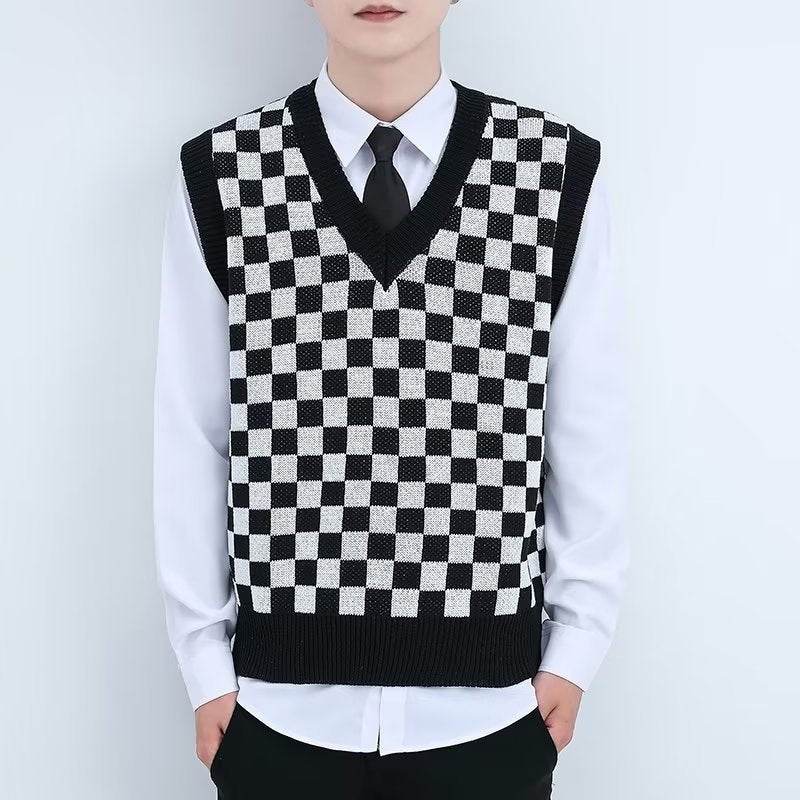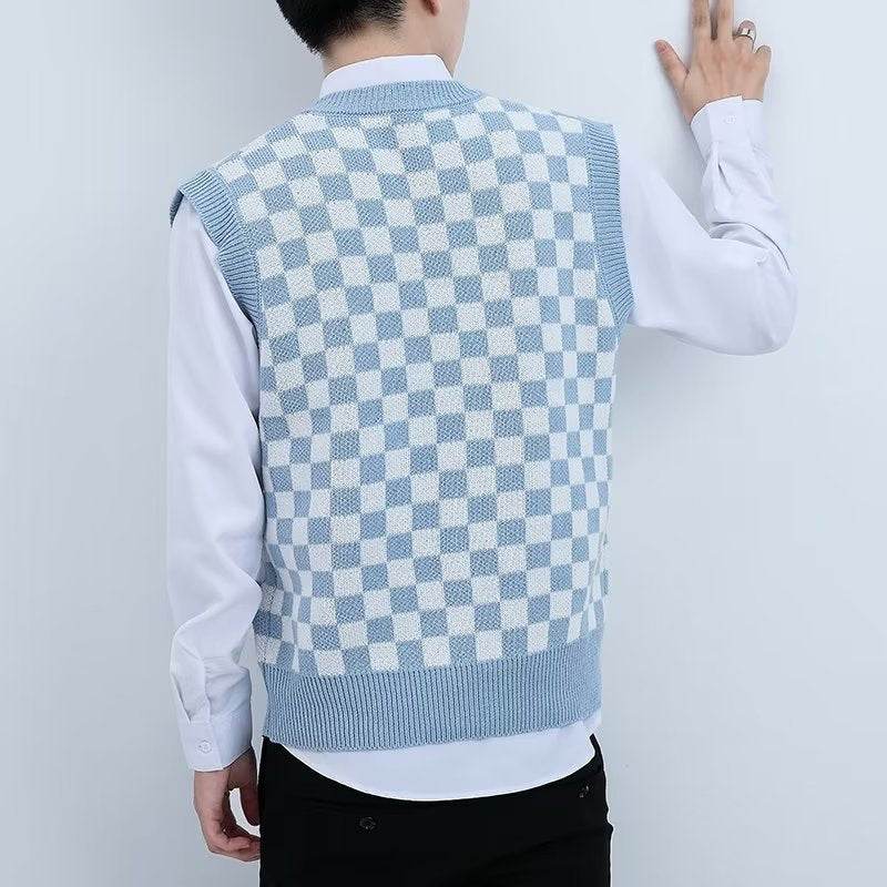 V-neck Knitted Boys' Checkered Sweater Vest - Mubimart