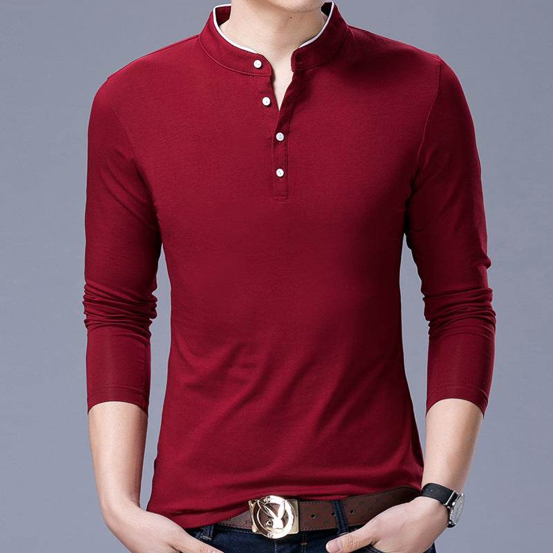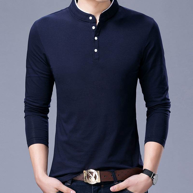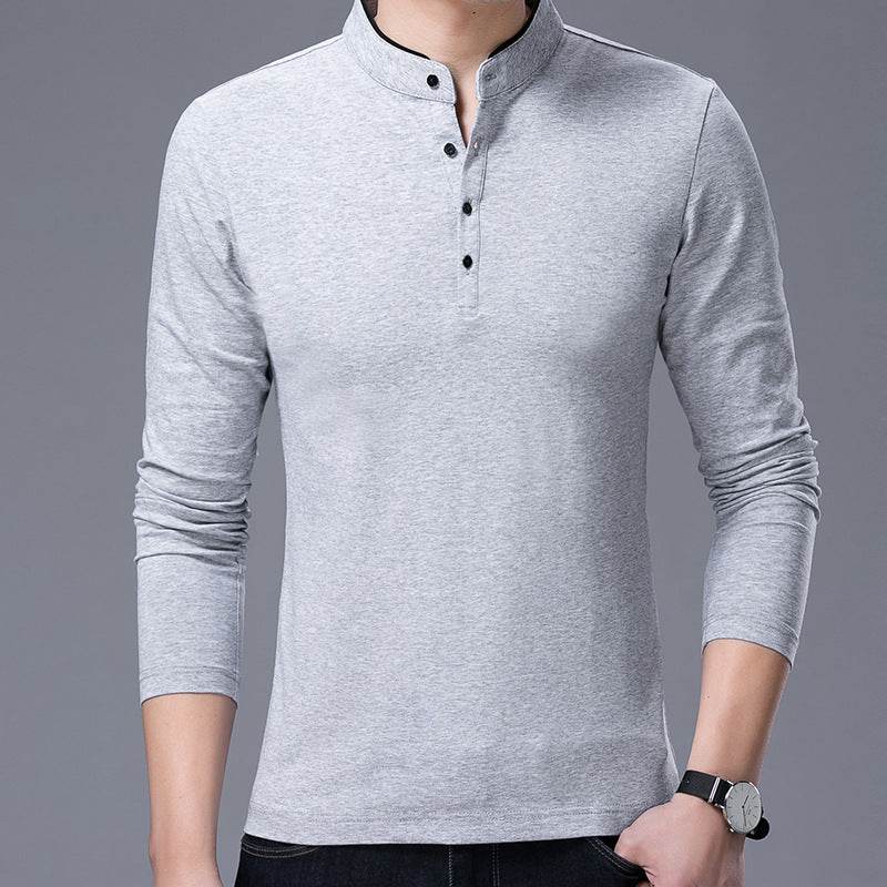 Mens Coton Stand Collar Long Sleeve T-Shirt - Mubimart