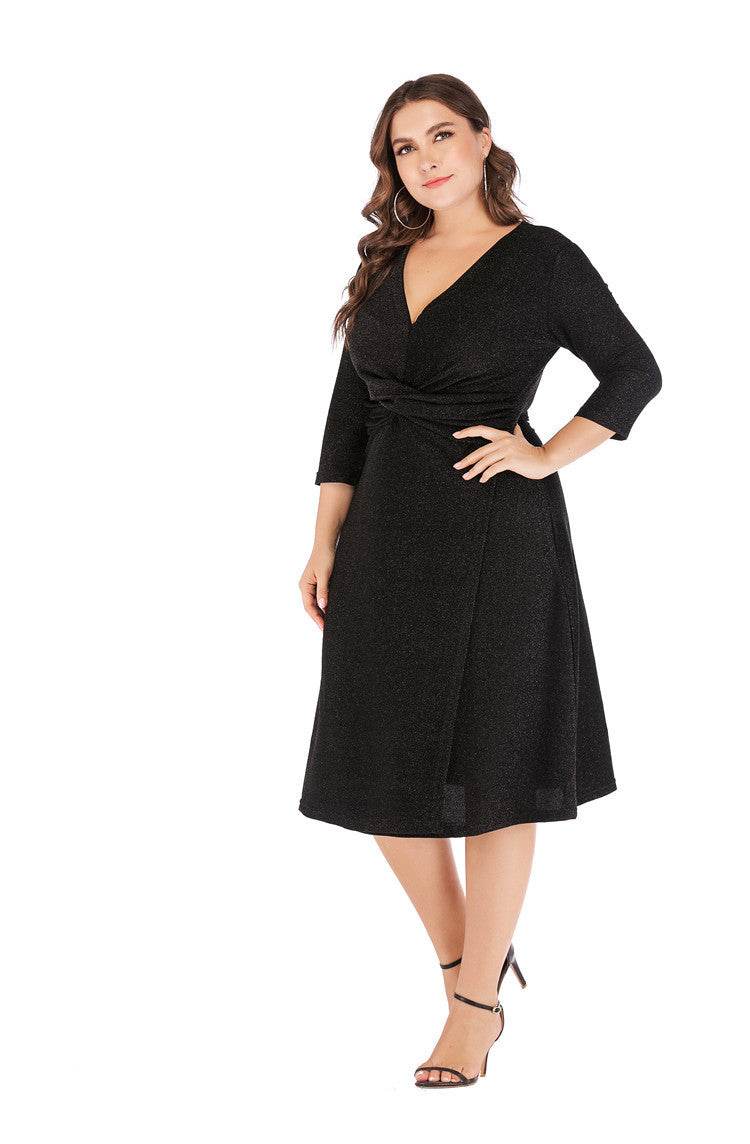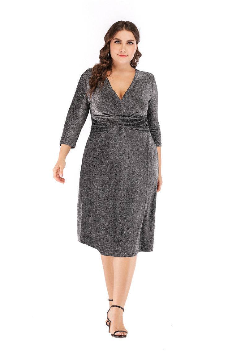 Plus Size V-neck 34 Sleeves High Waist Midi Skirt Bright Silk Party Dress