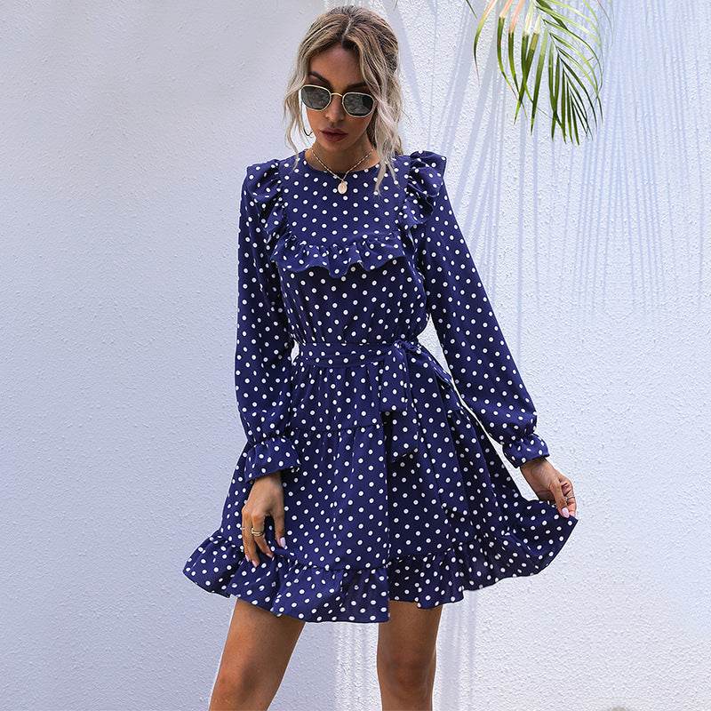 Autumn And Winter Dress Long-sleeved Polka Dot Ruffled Lace-up Skirt