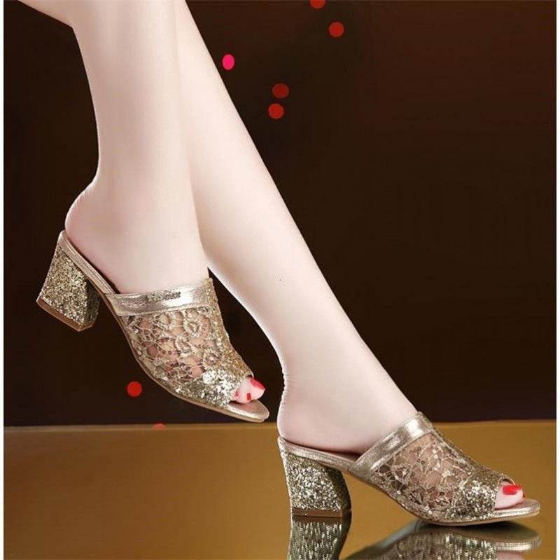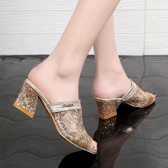 Mules Heeled Sandals Mules Sparkly Sequin Chunky Heel Peep-toe Lace Shoes Daily Party