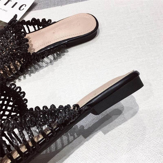 Womens Flats Shoes Mules Rattan Slippers Hollow Slipper Pointed Toe - Mubimart