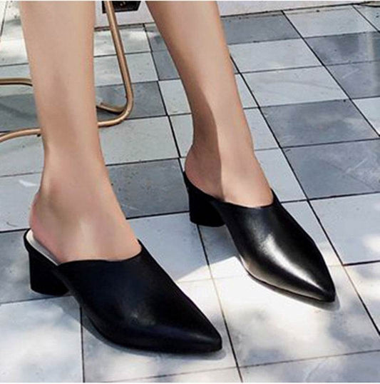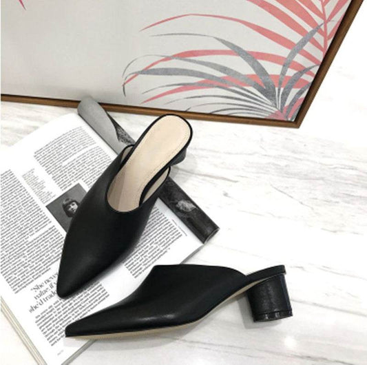 Leather Half Slippers Mules Versatile Thick Heel High Heel Slippers