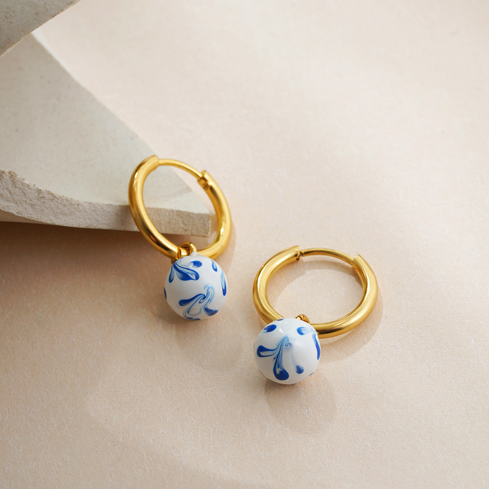 Vintage Hand Painted Blue And White Ceramic Beaded Earrings