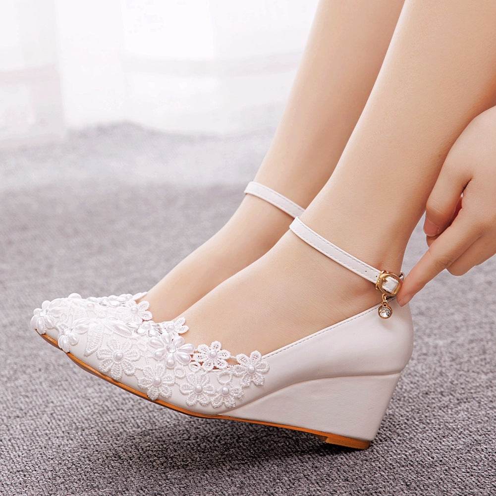 Round Toe Wedge Pumps Bridal Wedding White Shoes