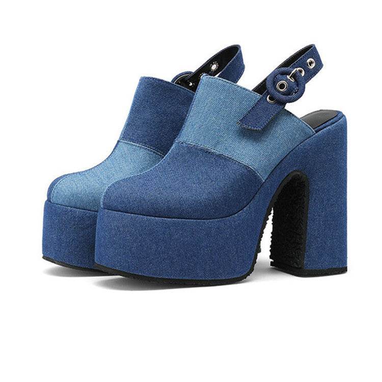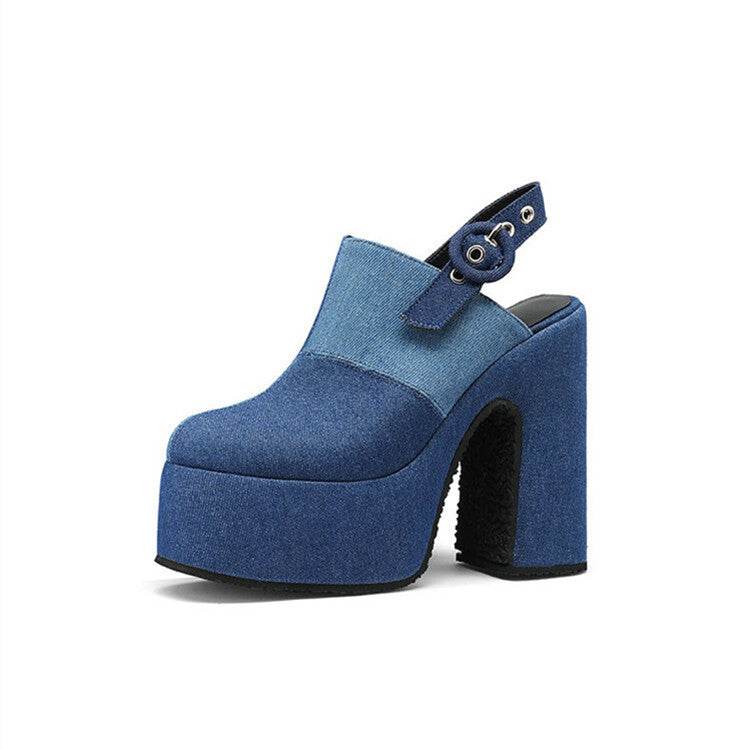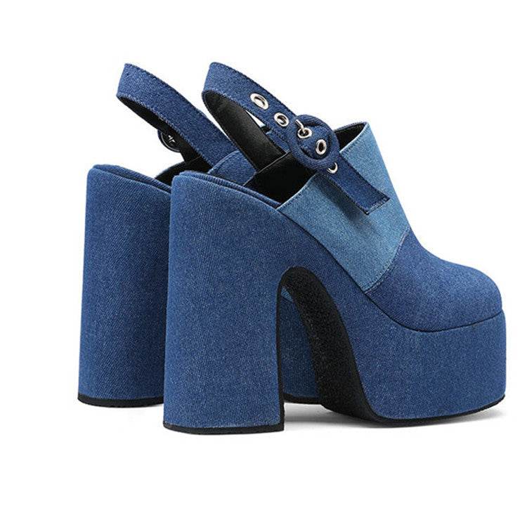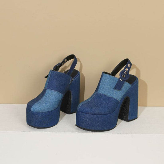 Color Block Denim High Heel Toe Box Slingback Sandals - Mubimart