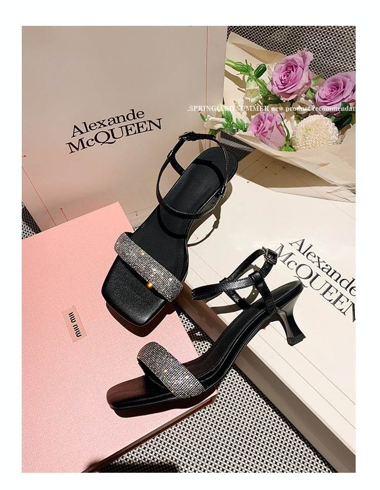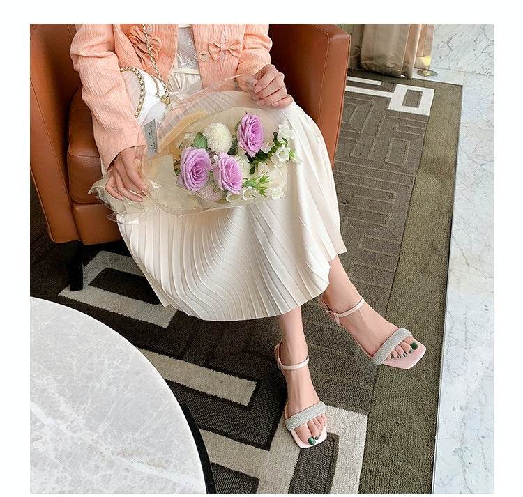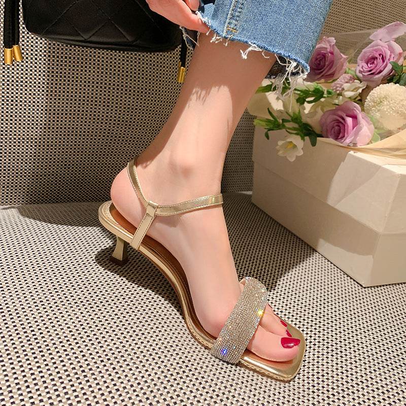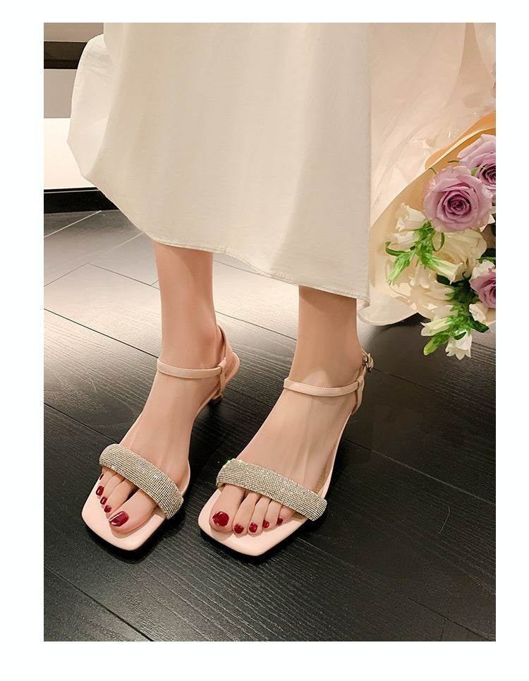Women's New Summer Fairy Style Mid Heel Square Toe Open Toe Classy Stilettos Rhinestone Strap Women's Sandals