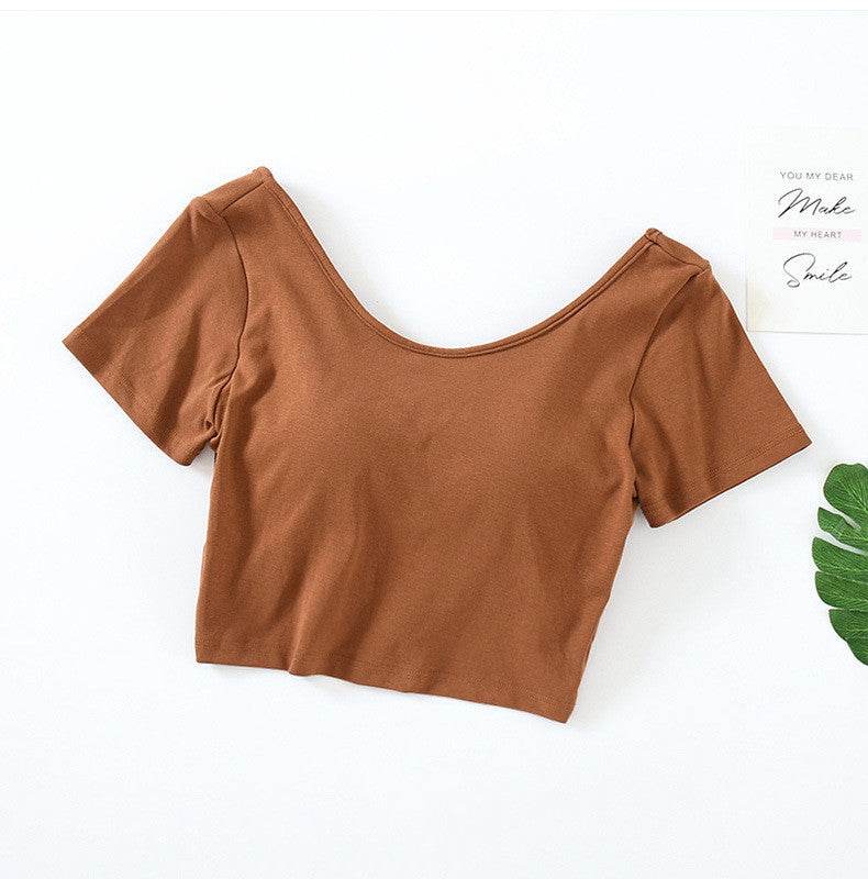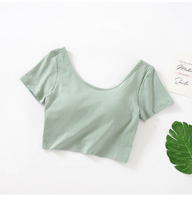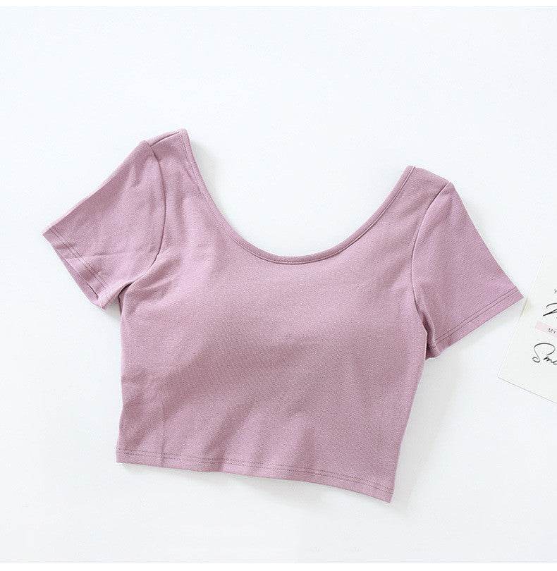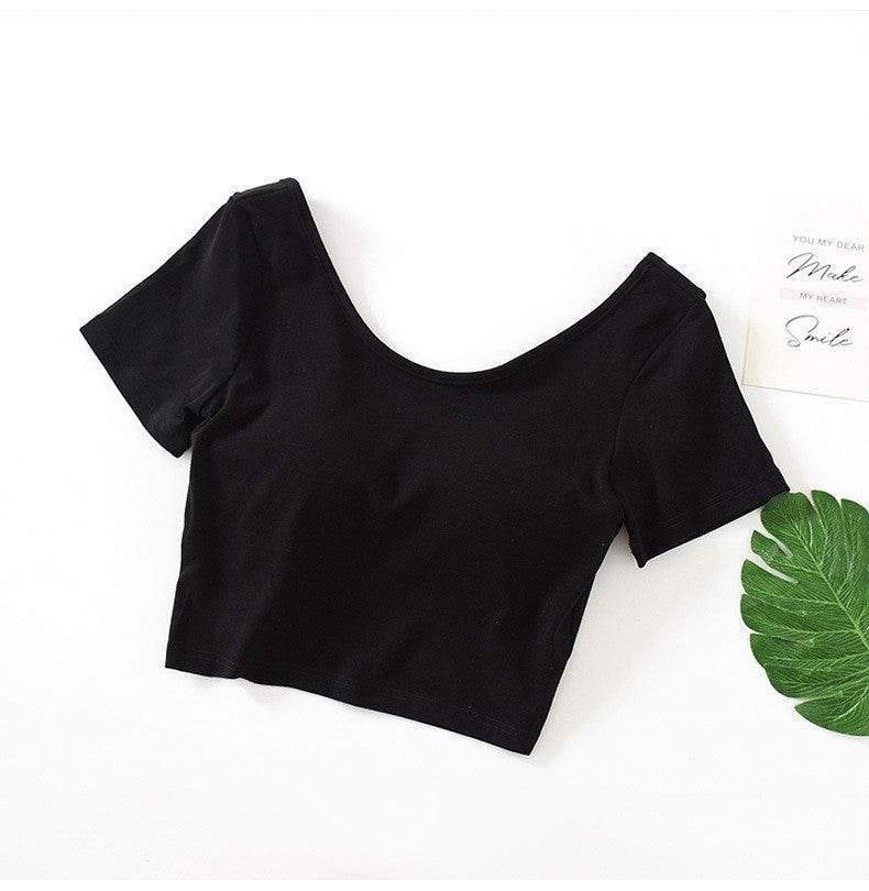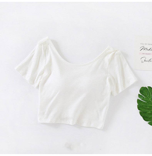 Comes With Chest Pad, Short-Sleeved, High-Waist, Big Round Neck T-Shirt, Women's Non-Wireless Cup And Bra Bottoming Shirt