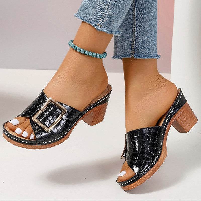 Fashion Crocodile-textured Buckle Sandals Square Chunky Heel Peep-toe Slides Slippers Women Shoes