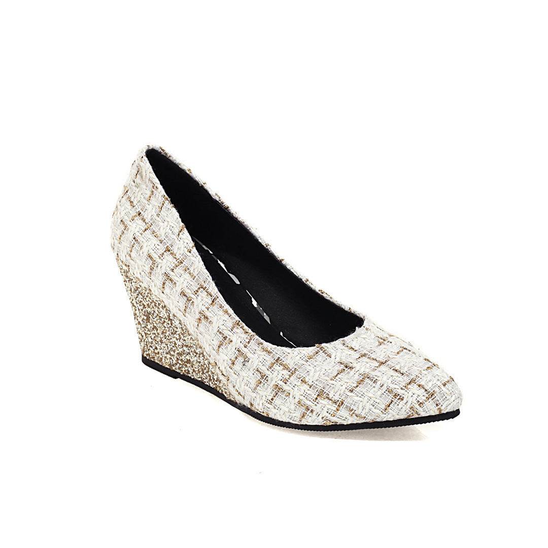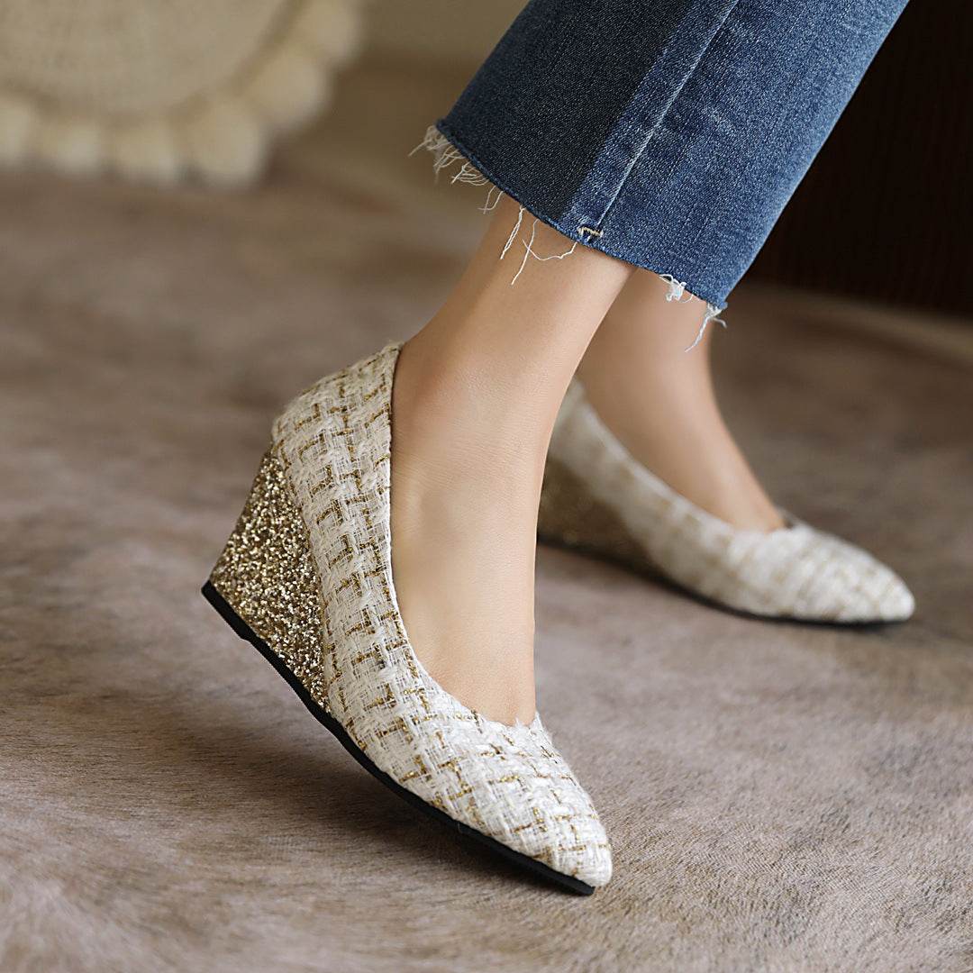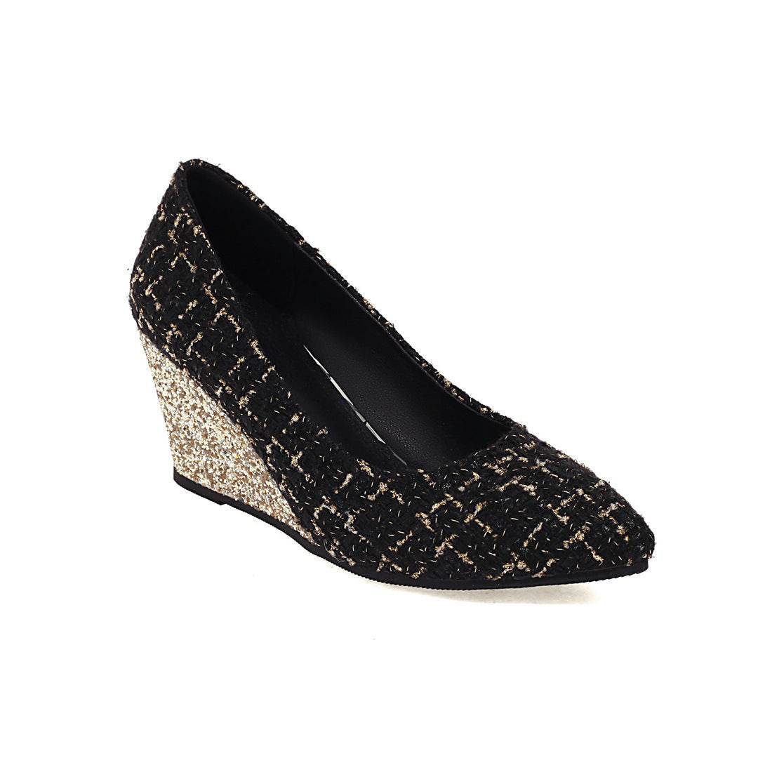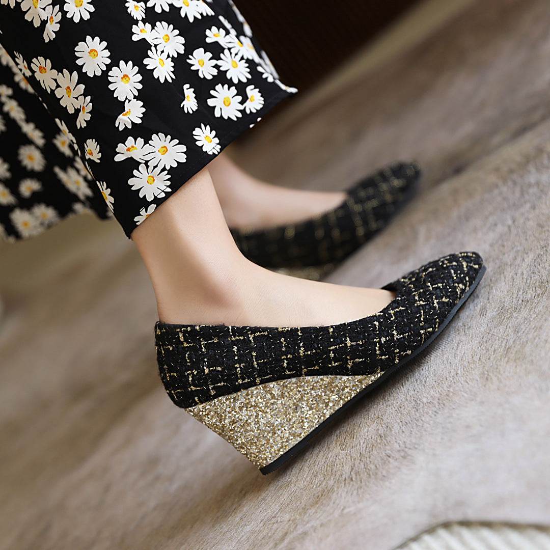 Wedge Heel Shiny Cloth Plaid Simple Fashion High Heels - Mubimart