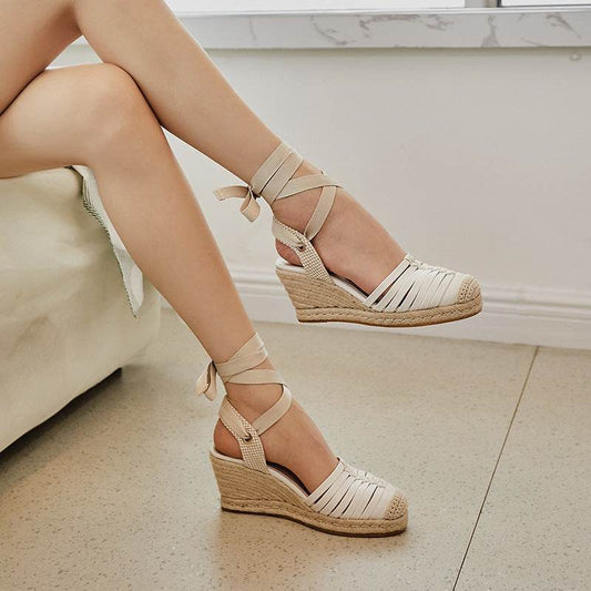 Platform Straw Woven Wedge Cream White Toe Cap Sandals Flat High Heels