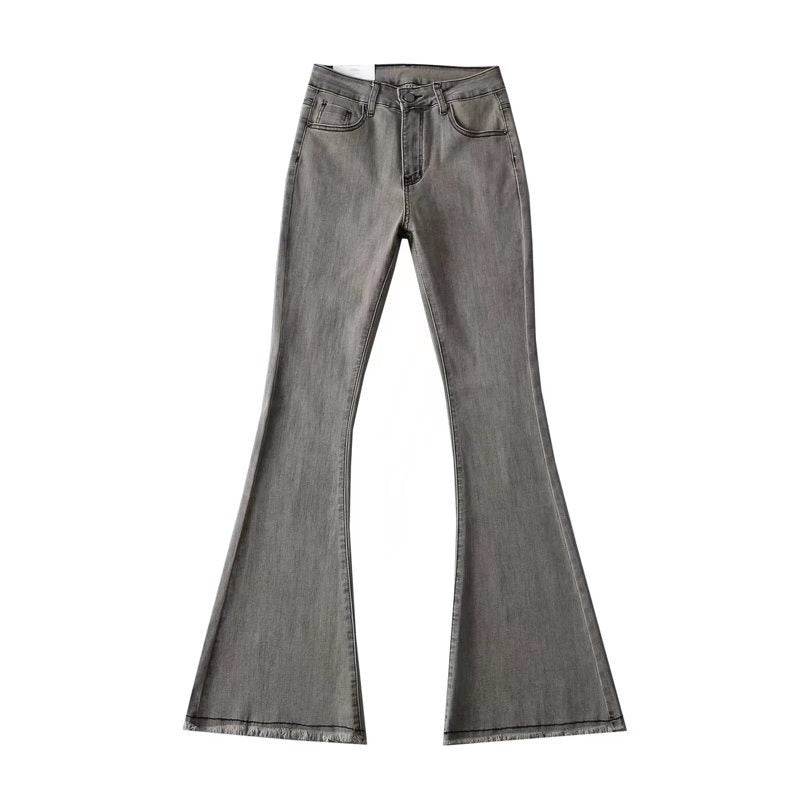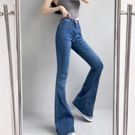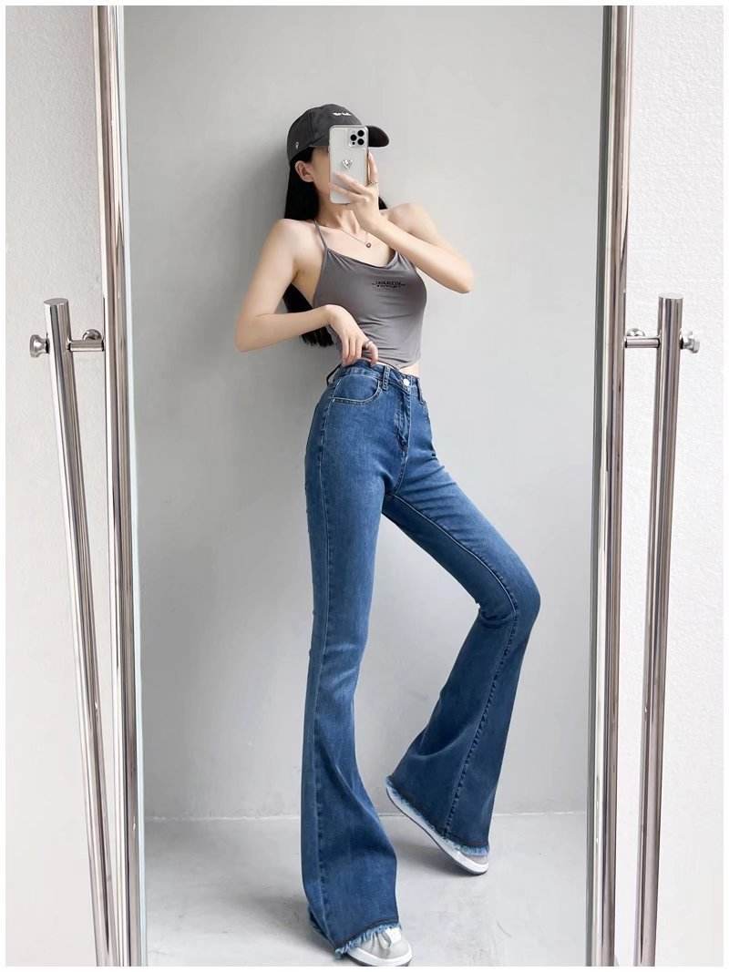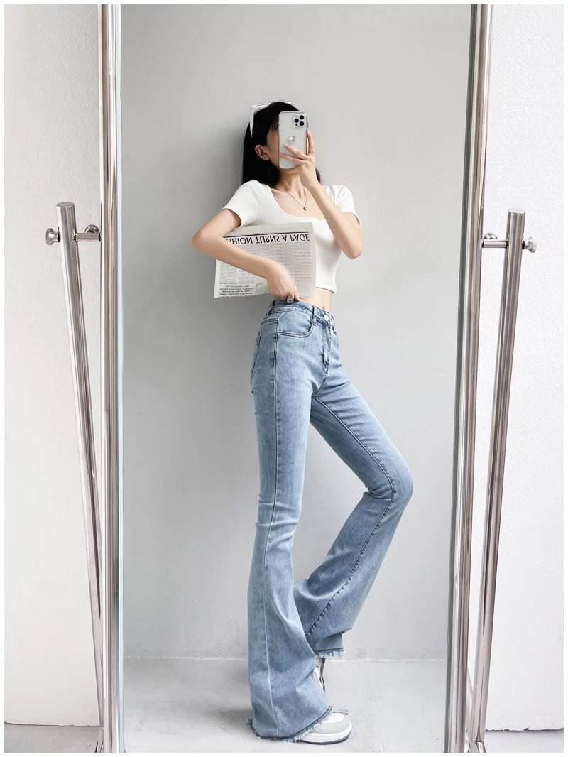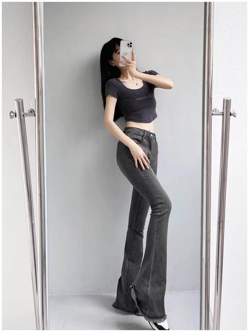 Autumn And Winter Fashion Small High Waist Raw Hem Jeans Retro Distressed Small Man Stretchy Wide-leg Slim Flare Pants