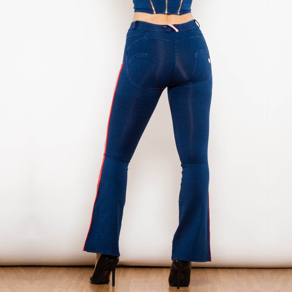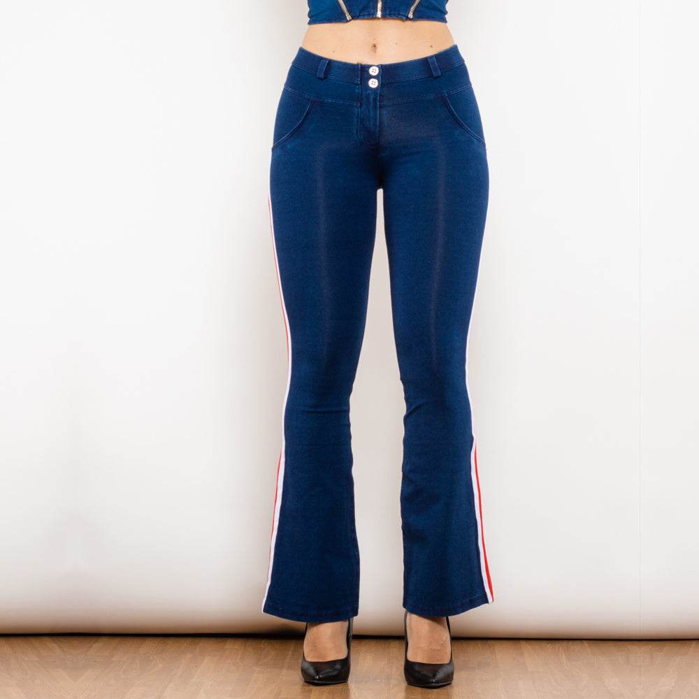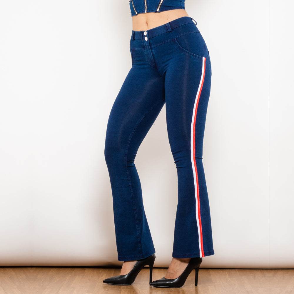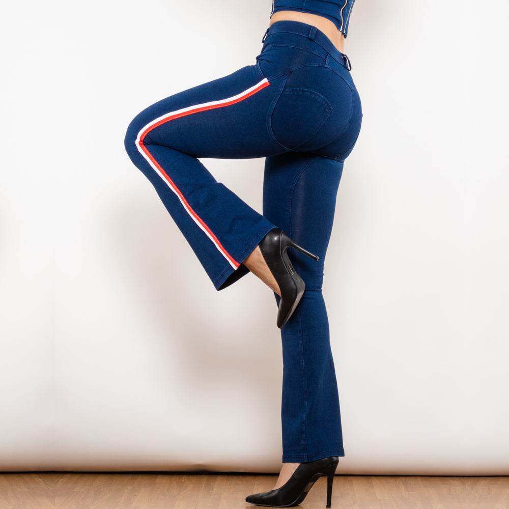 Shascullfites Melody Fashion White Red Side Stripe Flare Jeans Butt Lifting Female Casual Elasticity Dark Blue Denim Bell Pants