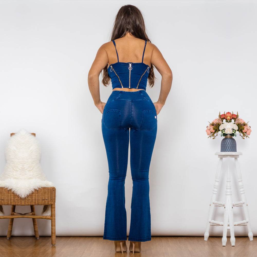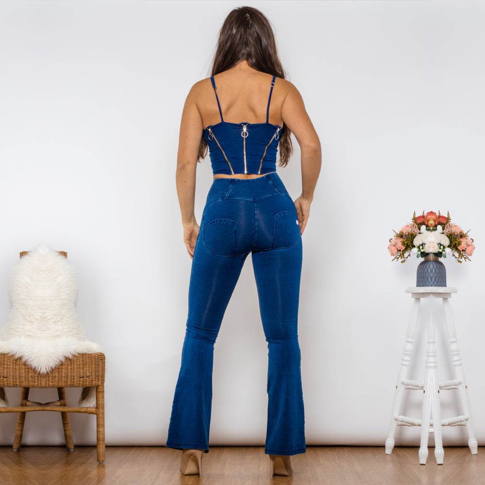 Shascullfites Shaper Set Bodysuit Zipper Push Up Top Dark Blue Jeans Top High Waist Flare Jeans Women Two Piece Outfits