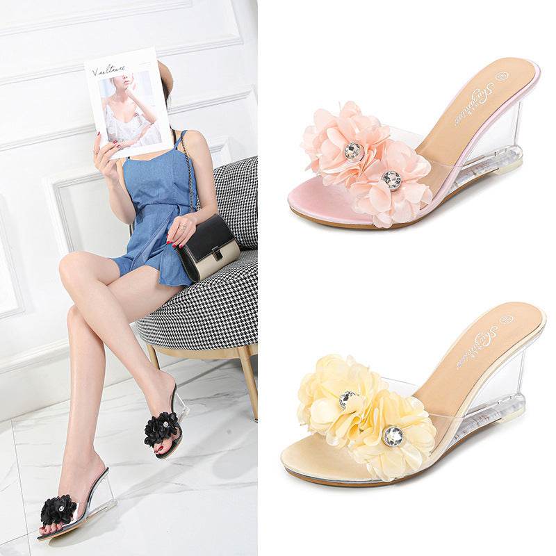 Versatile Summer Flower Simple Slope Heel Sandal Transparent Heel