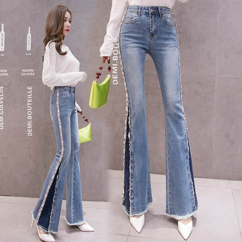 Embroidery Beaded Fashion Flared Pants High Waist Slimming Jeans Women - Mubimart