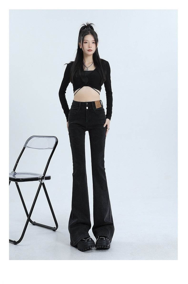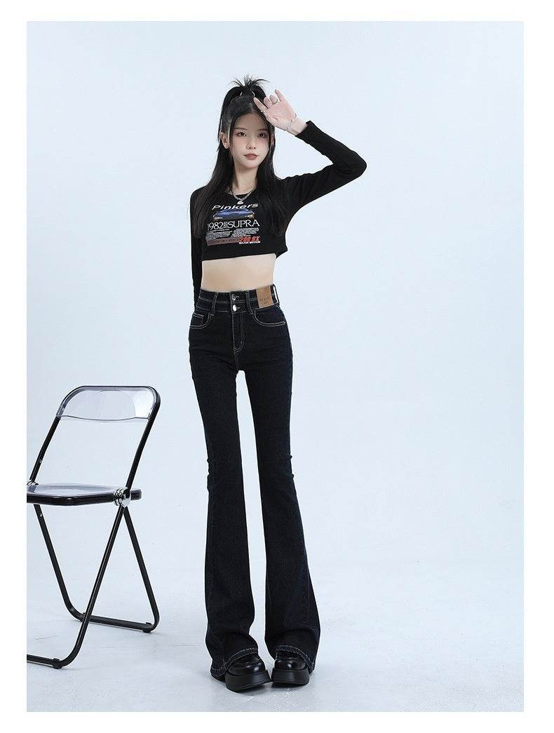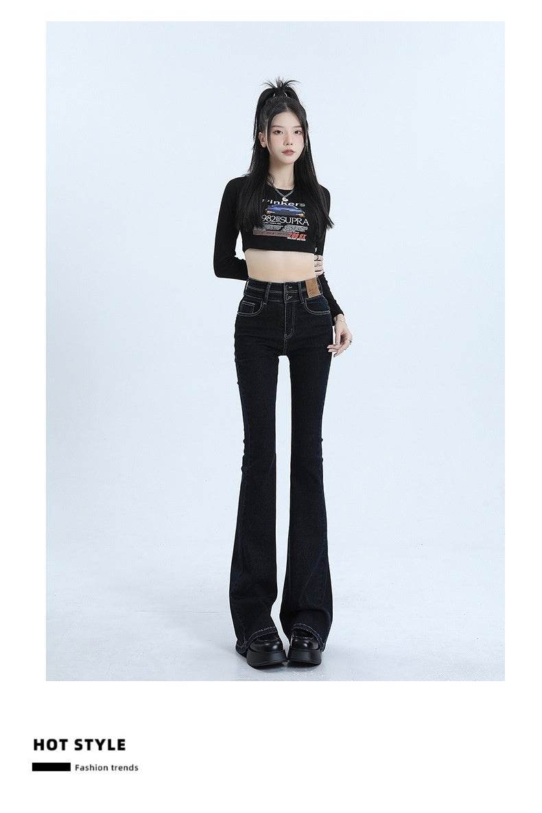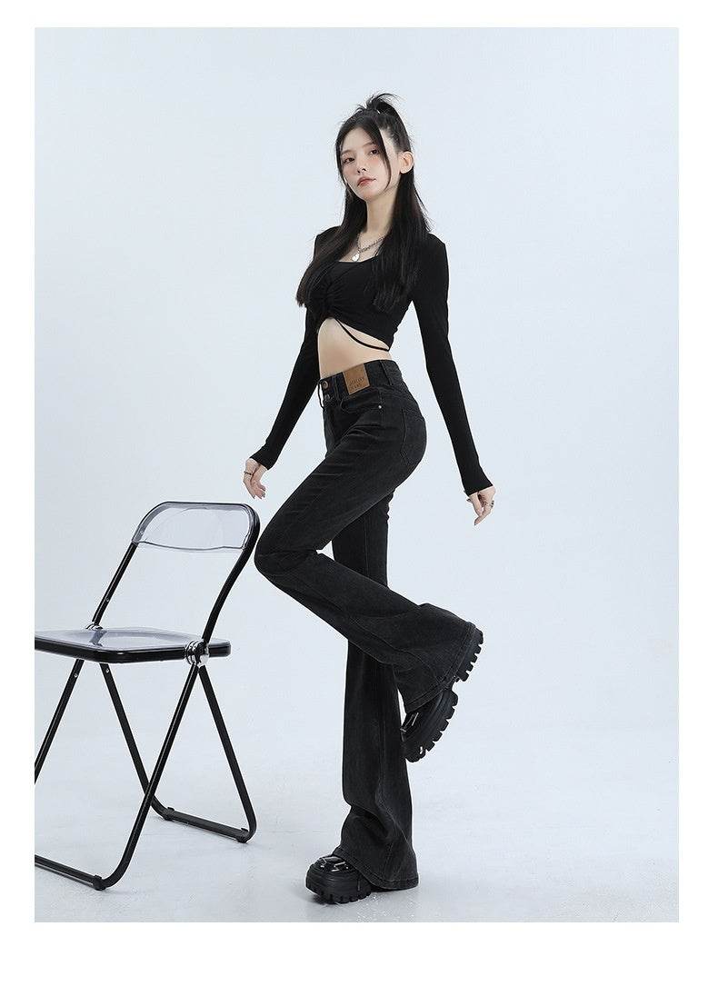 High Waist Slimming Hot Girl Double Buckle Slightly Flared Jeans Women