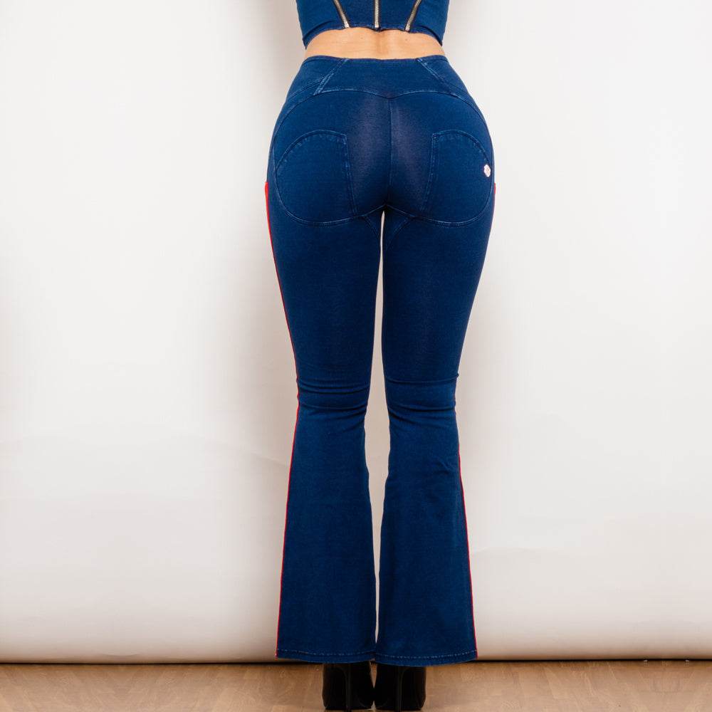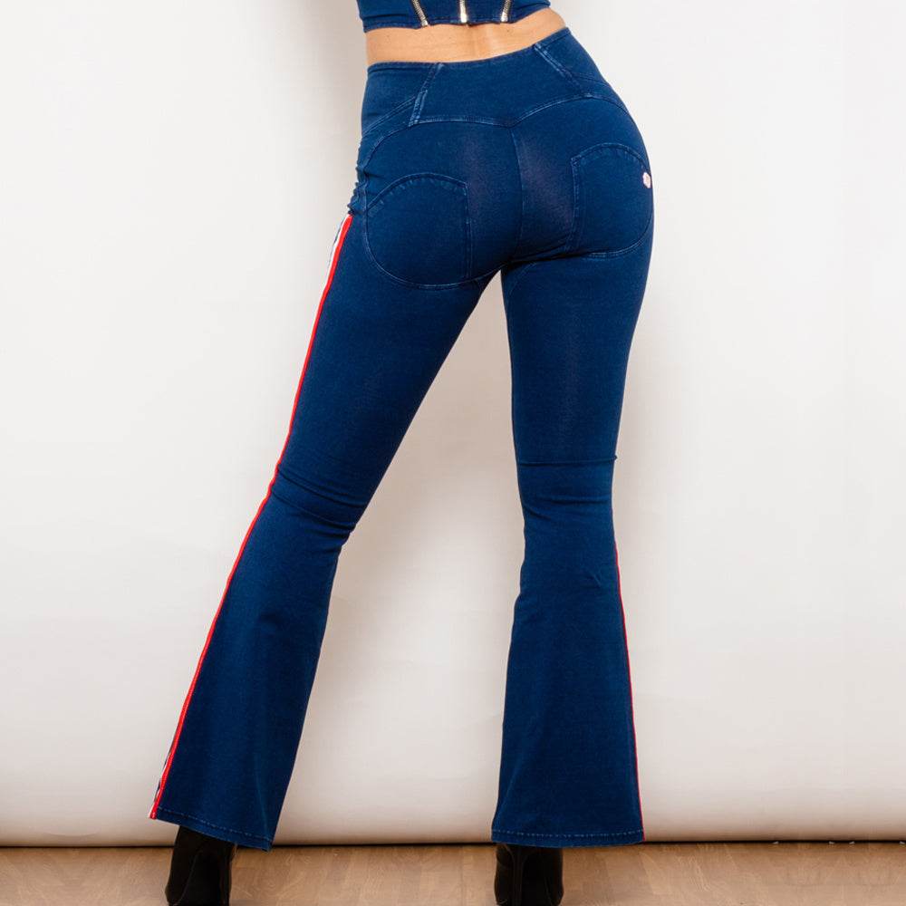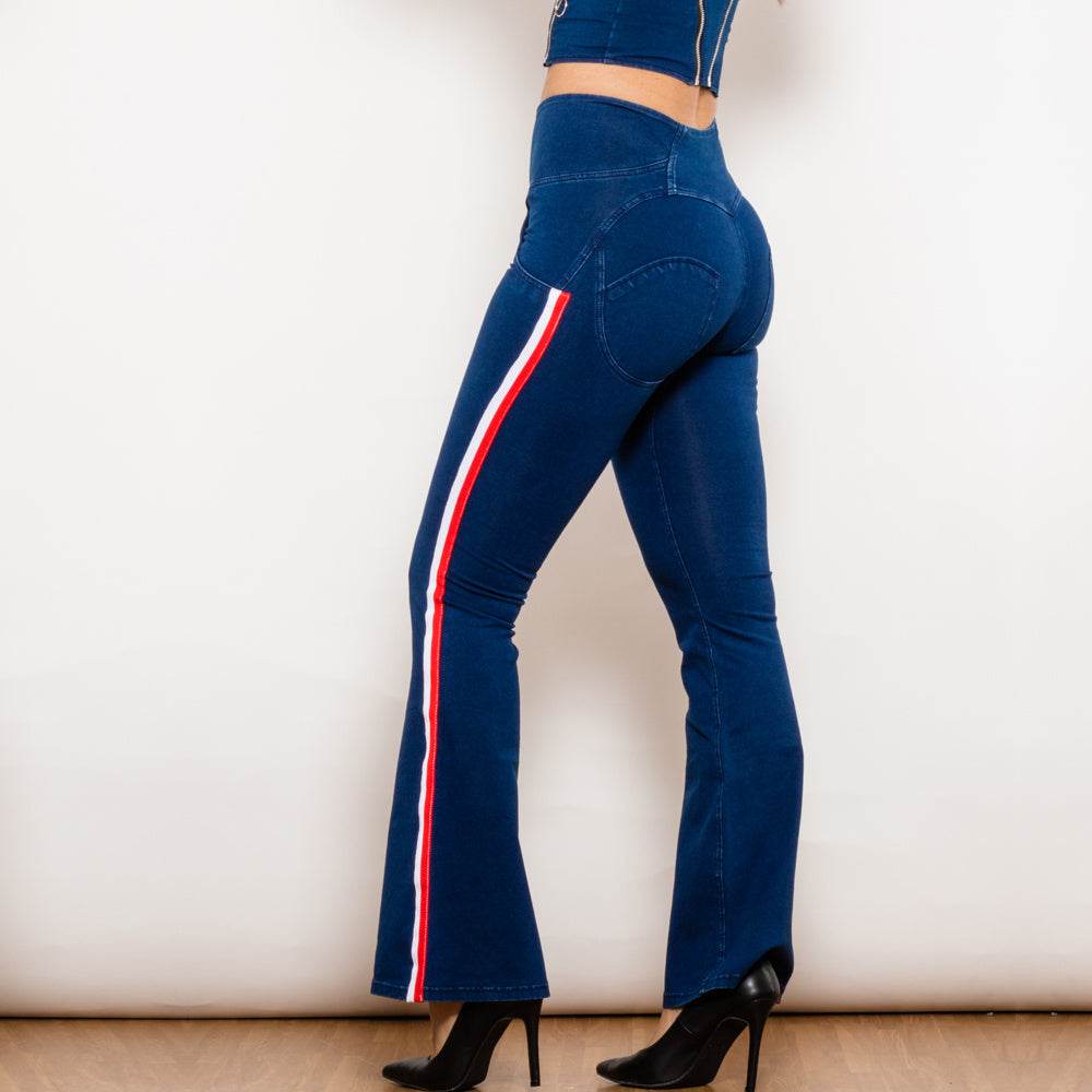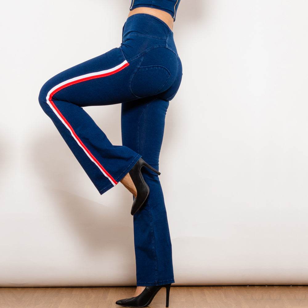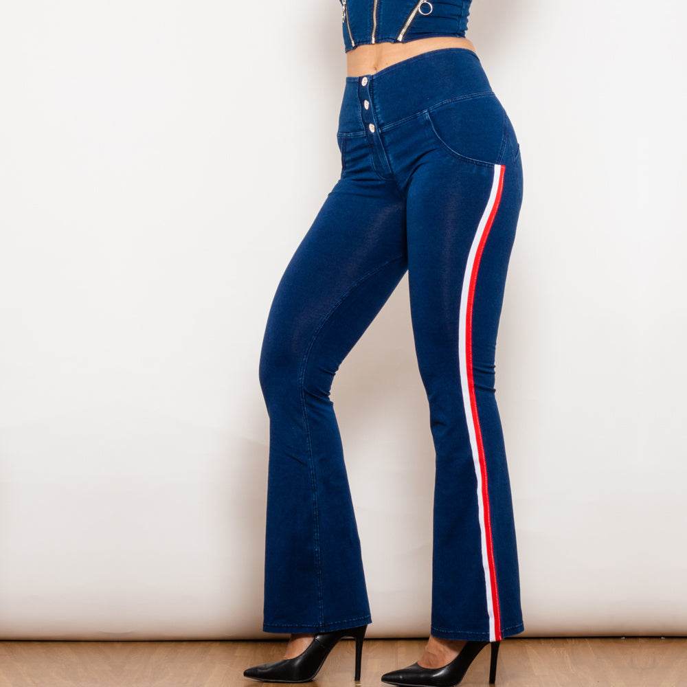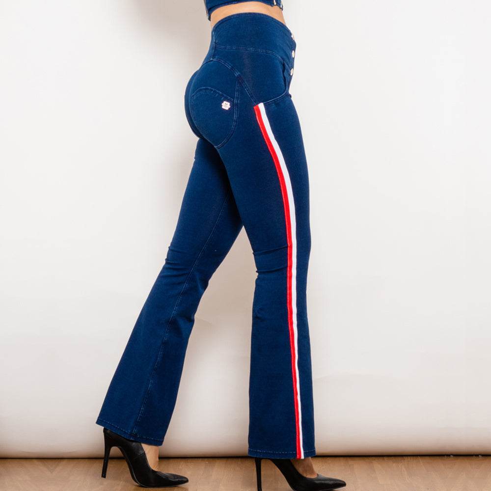 Shascullfites Melody Dark Blue Striped Flared Lift Jeggings Button Up Jeans Bum Lift Jeans High Waist Flare Jeans Women