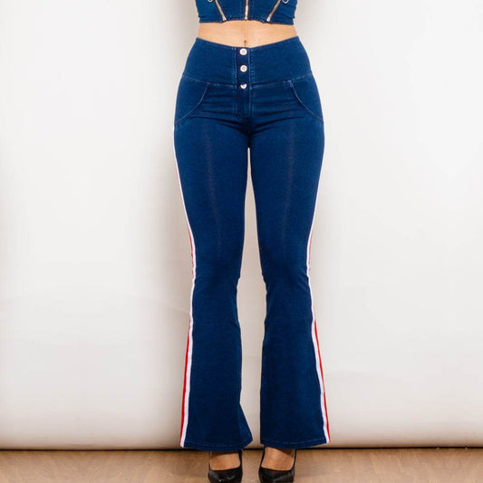 Shascullfites Melody Dark Blue Striped Flared Lift Jeggings Button Up Jeans Bum Lift Jeans High Waist Flare Jeans Women