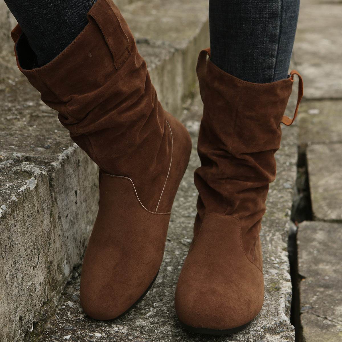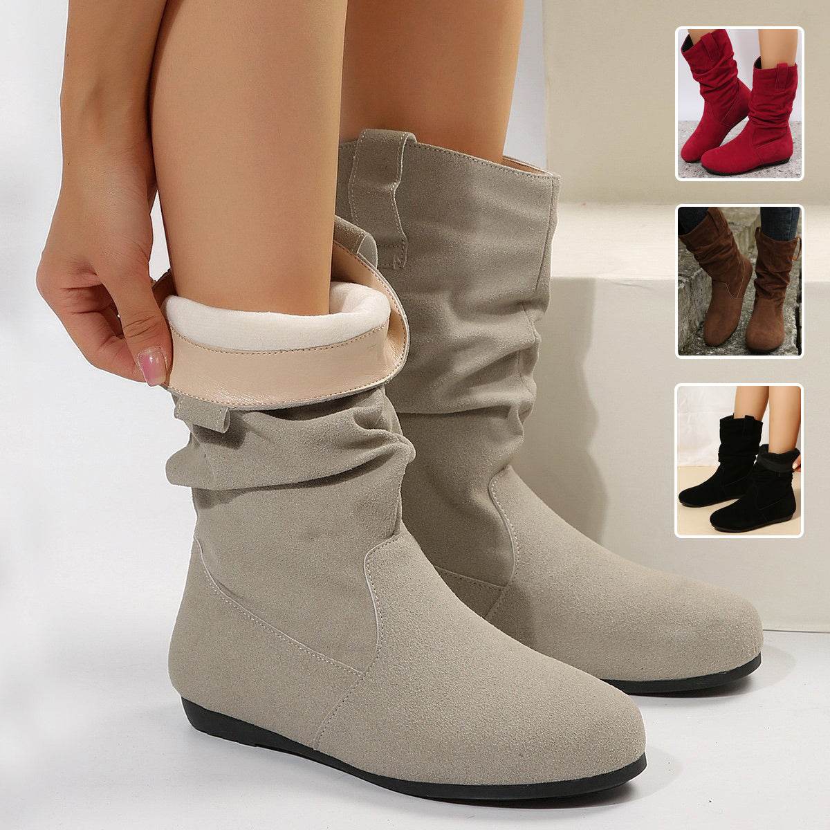 Round Toe Flat Boots Fashion Solid Color Suede Mid-calf Boot Winter Warm Shoes For Women