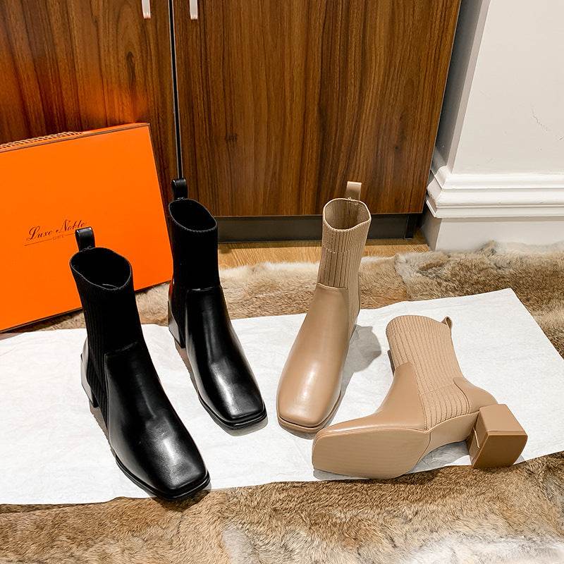 Chunky Heel Square Toe Knit Martin Boots