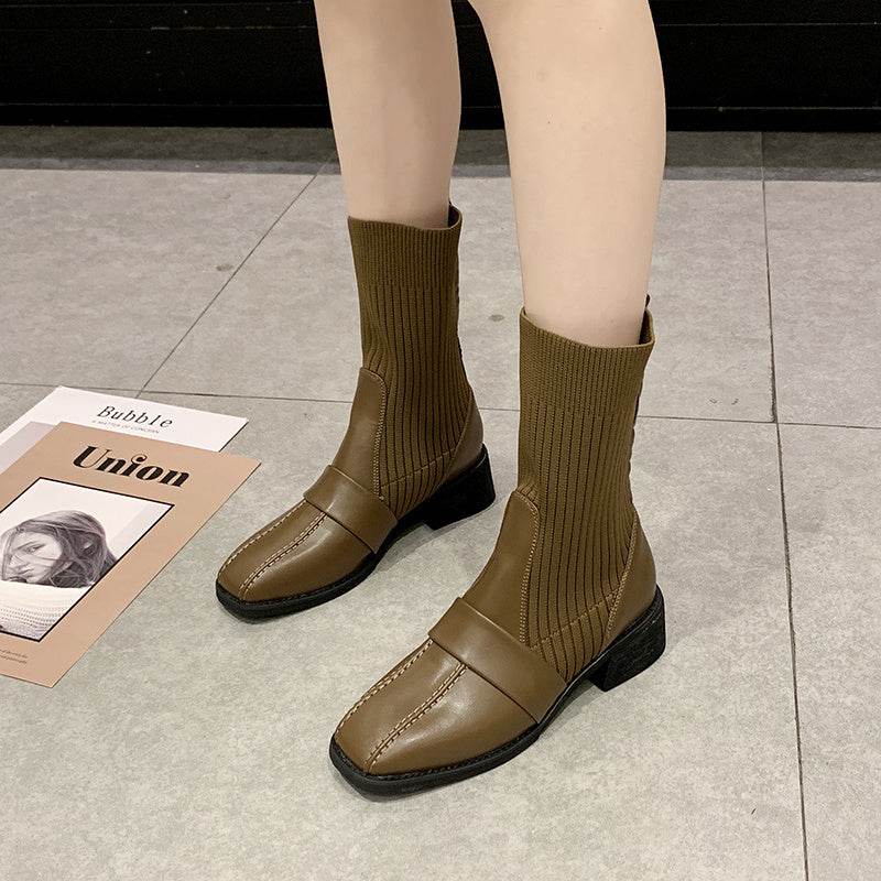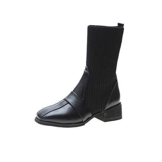 British Style Square Toe Mid-tube Knitted Martin Boots Women