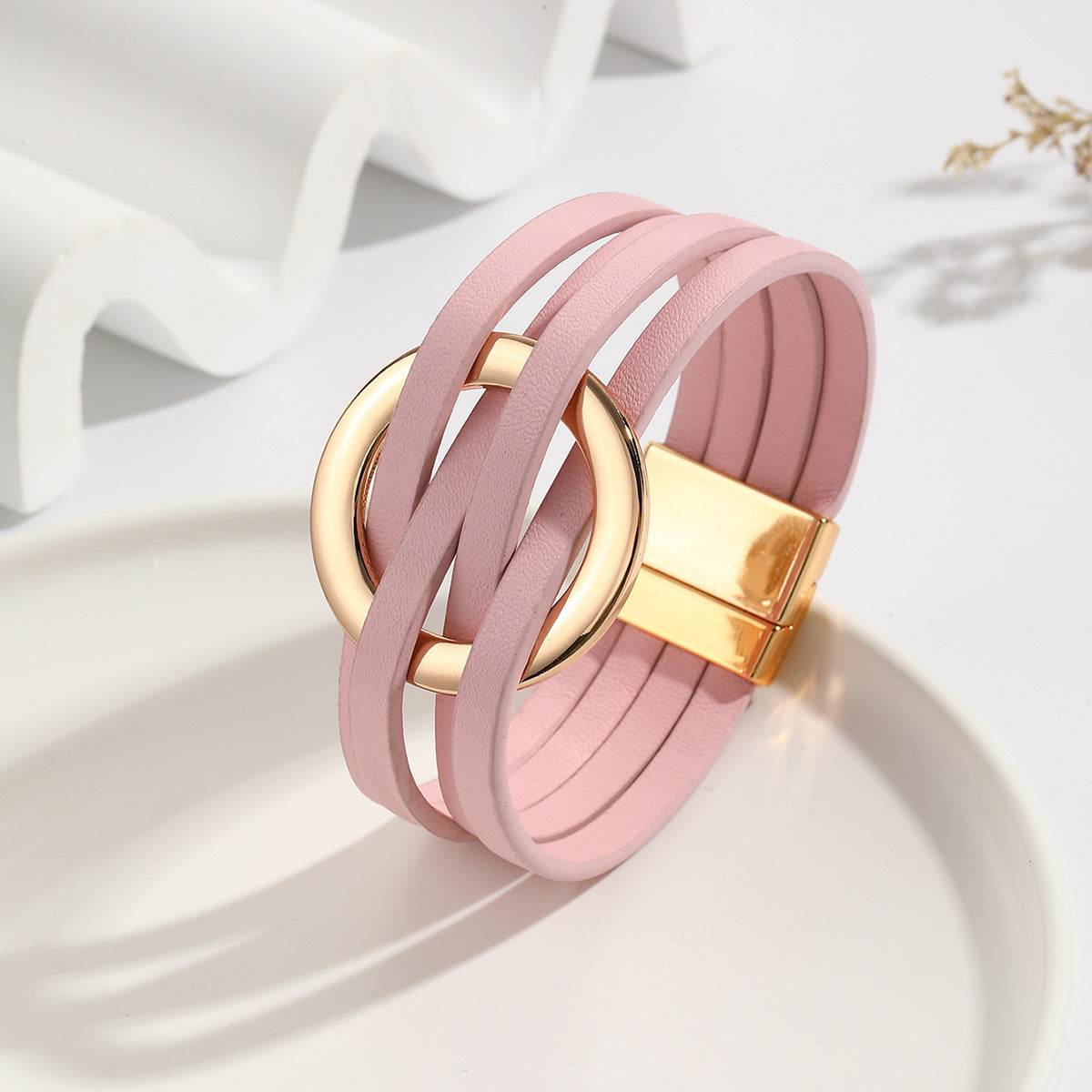 Cross Leather Women Bracelet Metal Big Ring Cuff Bangle Multi-layer Wristband Magnetic Snap Bangle