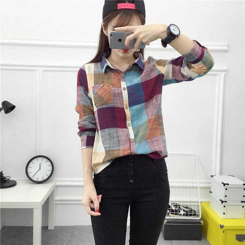 asual Plaid Women Blouses Kimono Vintage Linen Cotton Long Sleeve Blouse Female Shirts Tops