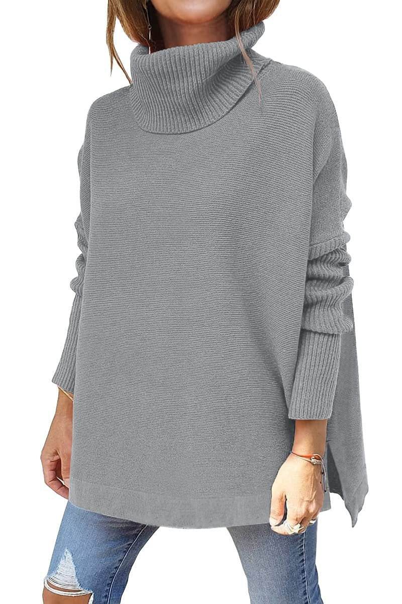 Turtleneck Sweater Mid Length Batwing Sleeve Slit Hem Tunic Pullover Sweaters Winter Tops Women Clothing